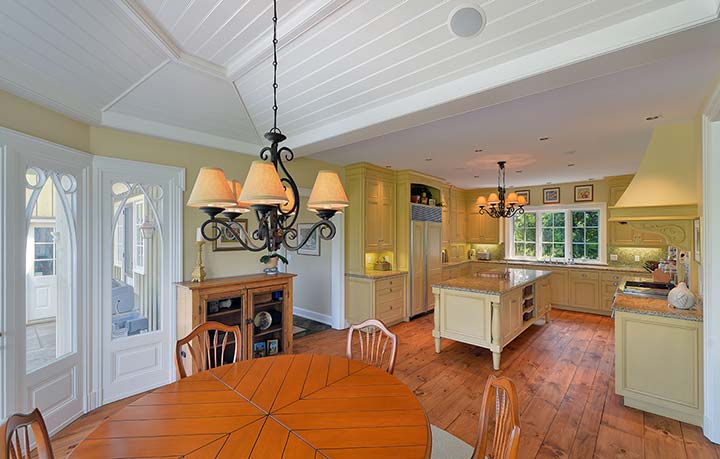 The French Country Kitchen is light and bright with pristine views in every direction. The large centre island, granite counters, top of the line appliances and vaulted ceiling all combine to make this a favorite family gathering area.