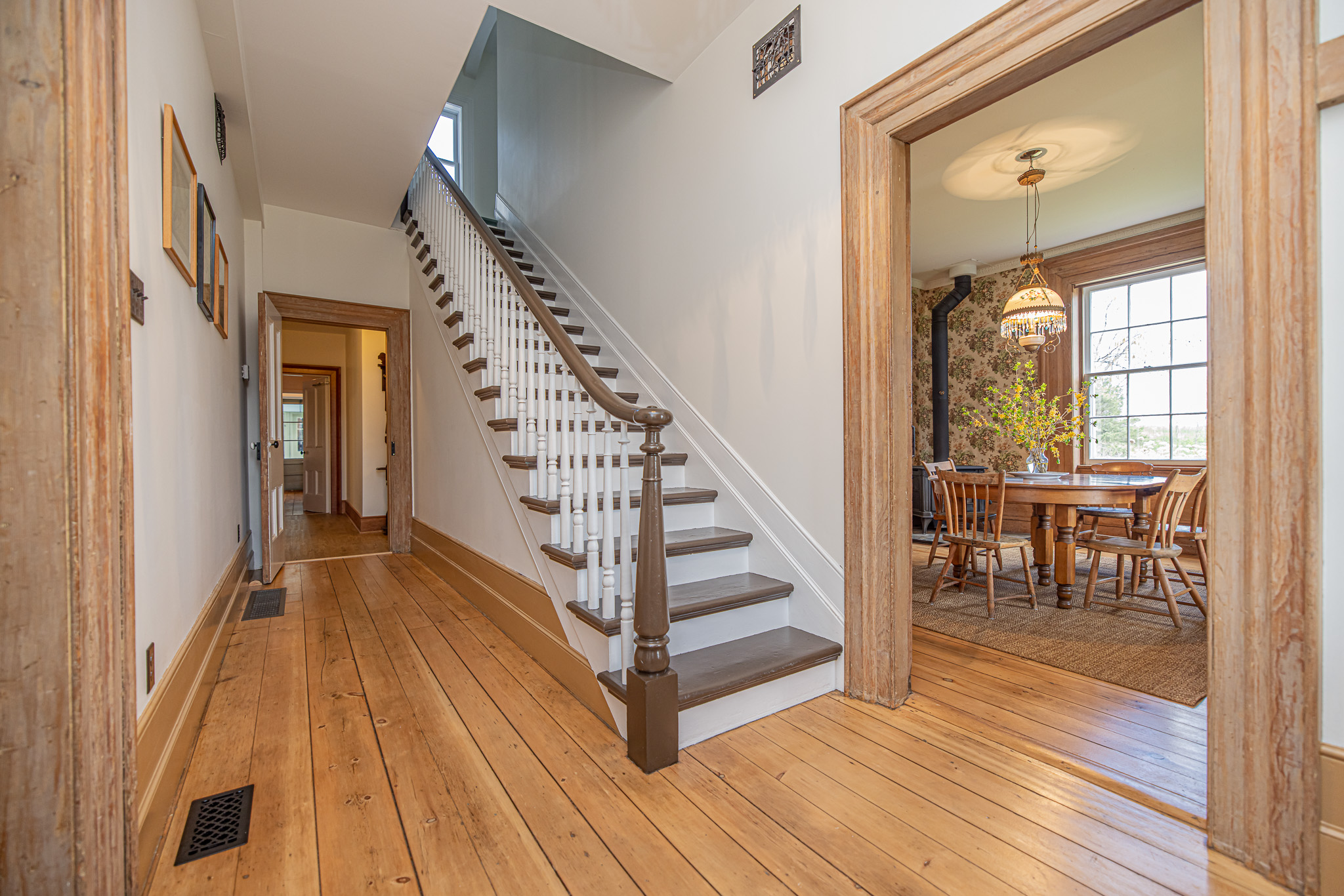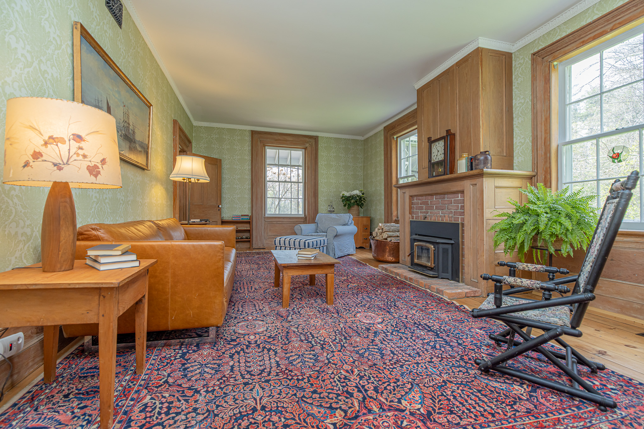 The large dining room has original wood floors, a wood stove and offers views over the surrounding countryside. The trim details, wood floors and patina of the room will be noticed by history enthusiasts.