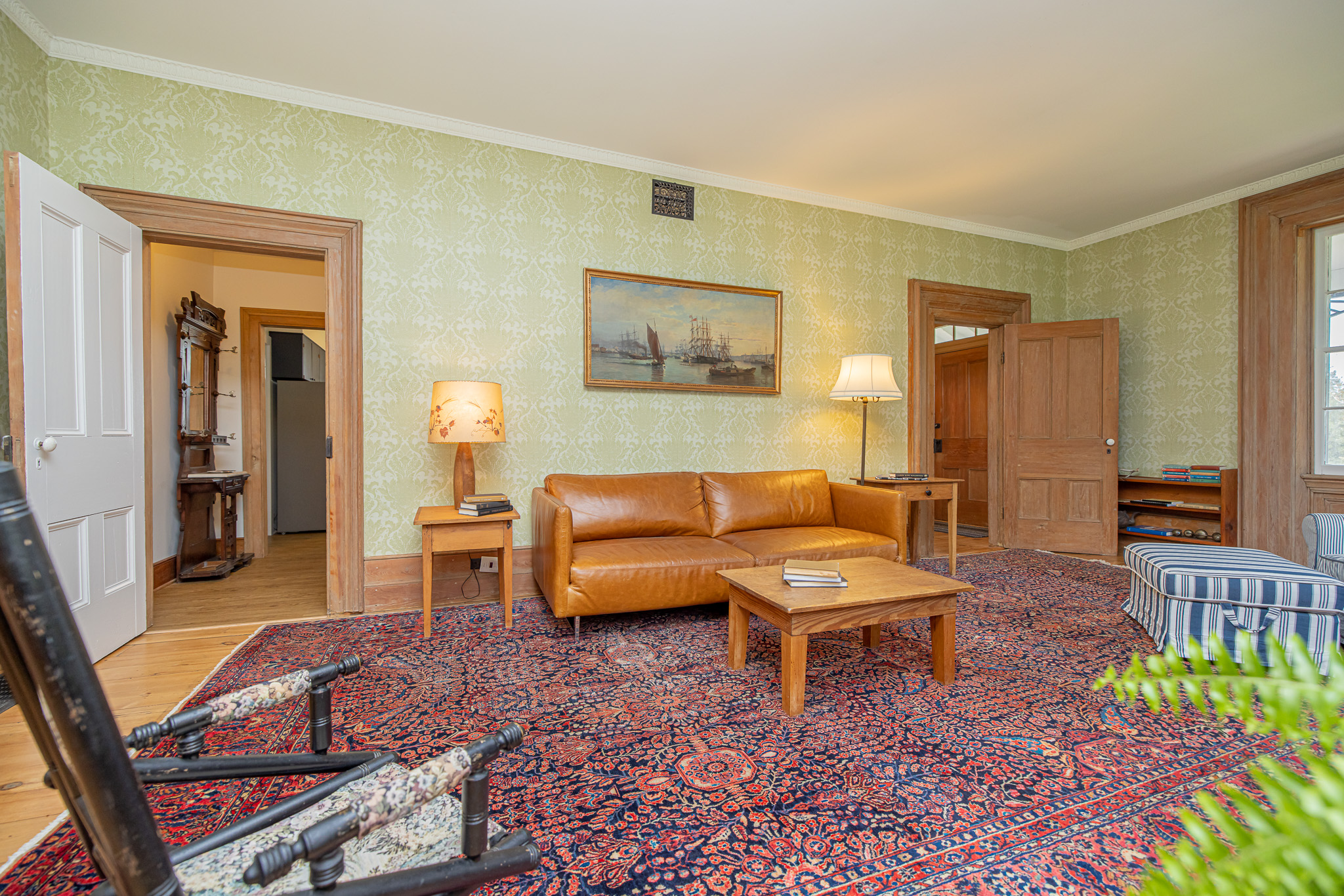 The sprawling living room has impressive ceiling heights, fireplace with custom mantel, historic trim, original floor and lovely views over the pond and pool. There is to the front porch from front hall off the living room.