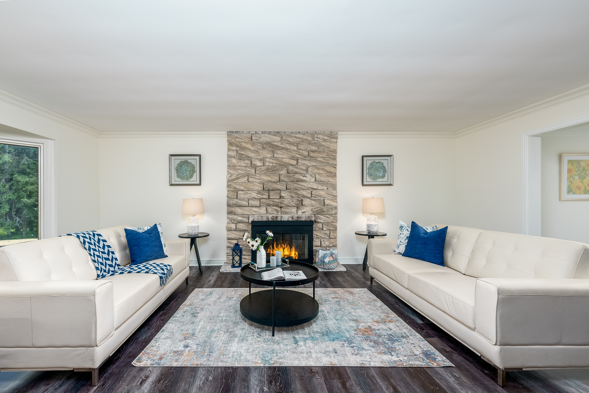 - Large living room with fireplace and south facing picture window
