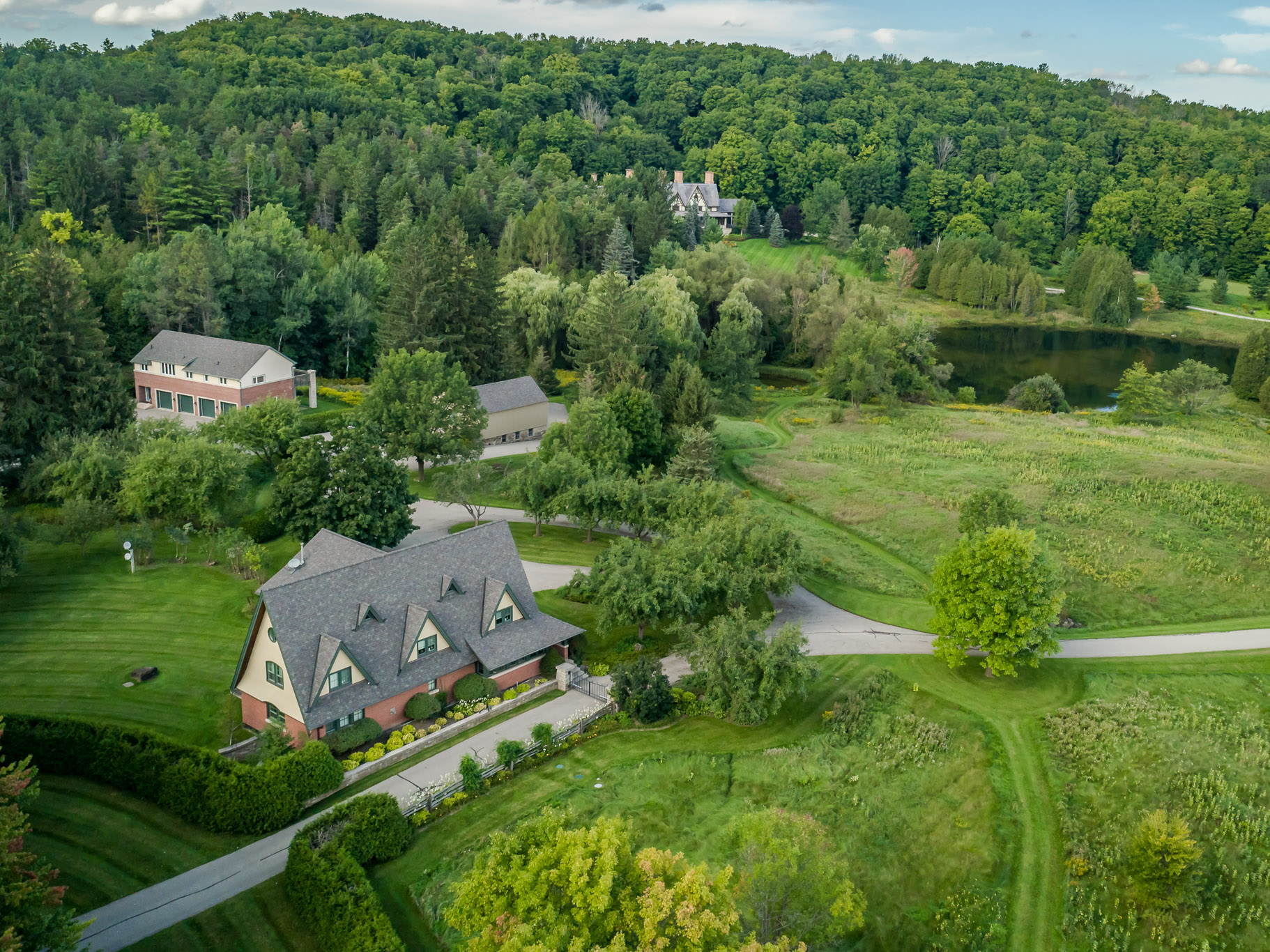 The winding paved drive leads past the Gate House and main trout pond to the main residence and surrounding guest houses.