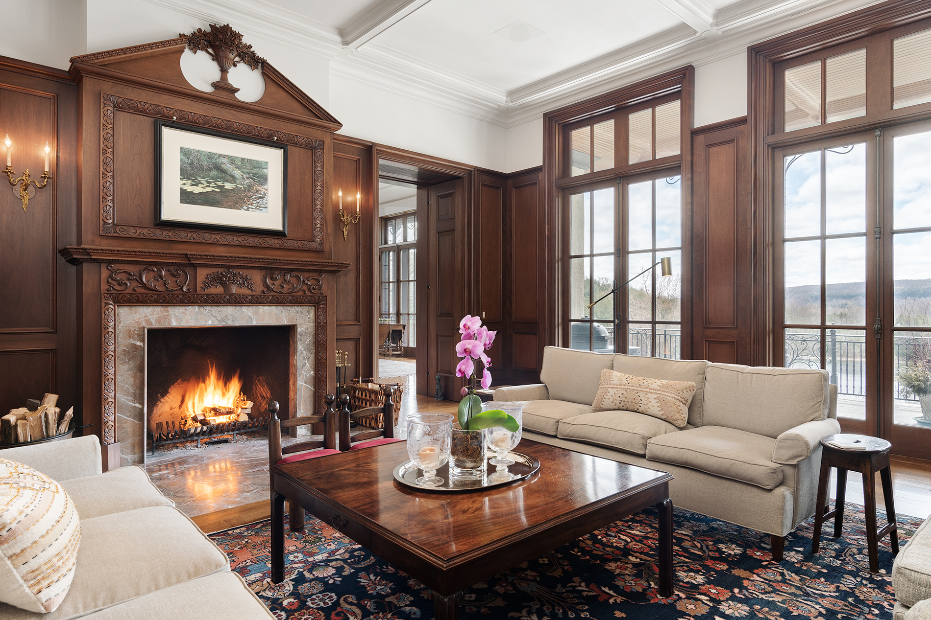 Wood-burning fireplace with marble hearth and surround, hand-carved mantle