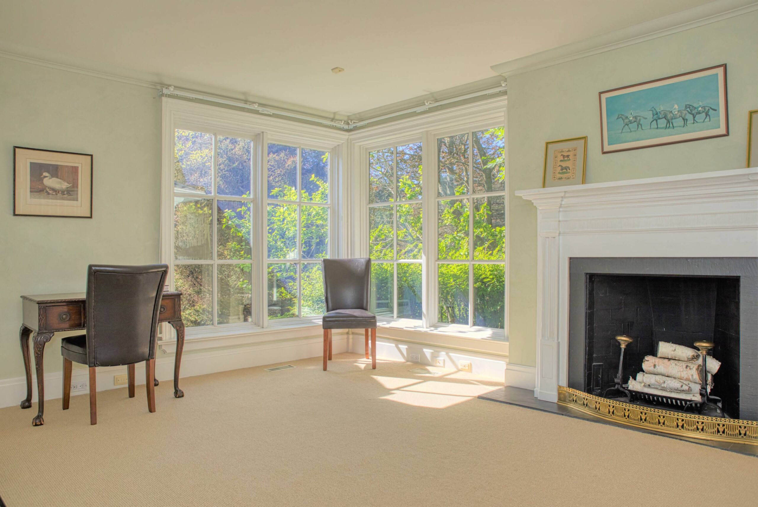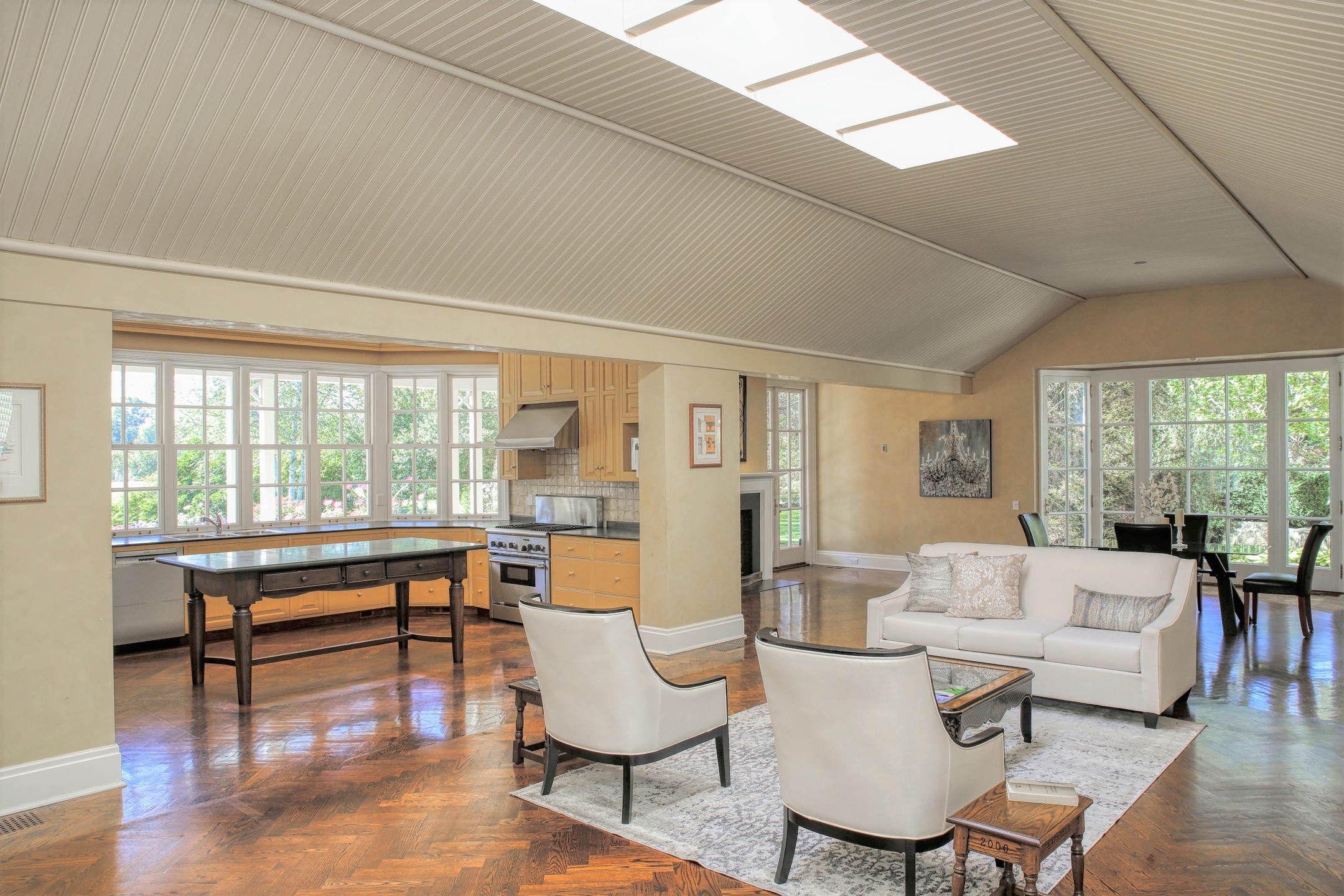 The home was completely redesigned and expanded by the noted architect, William Grierson, along with designer, Robin Vaile. The home has a large central living room with fireplace and an expansive beamed and vaulted ceiling. Combined with this large living room is the kitchen overlooking the gardens and the dining room on the west end of the home. There are walk-outs from the living spaces onto the large flagstone terraces and covered porches.