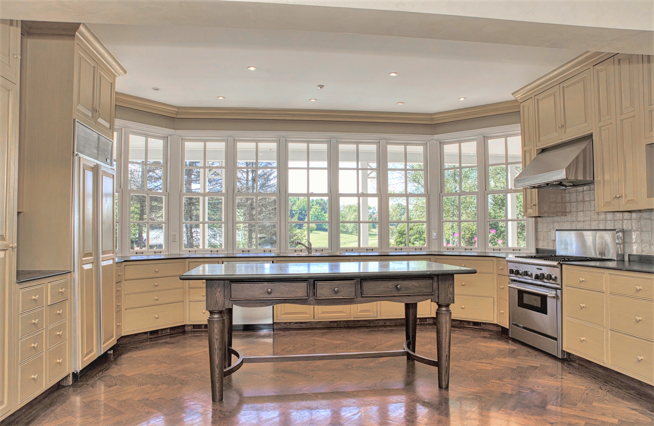 The kitchen has a wall of south facing windows which overlooks the gardens and the flagstone deck to the rolling fields on the horizon. The kitchen has a large free-standing centre island breakfast bar, stone counters and panelled built-in cabinetry.