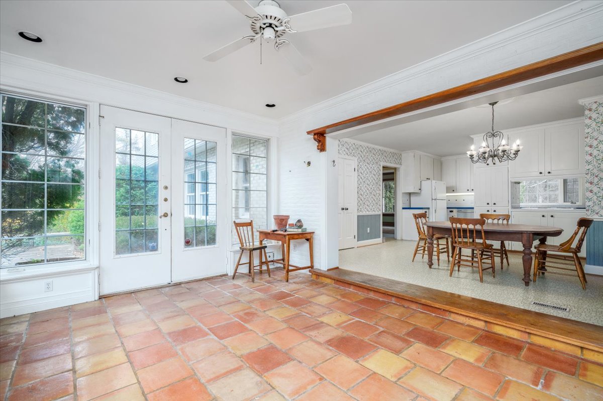 A formal dining room, panelled office with a wood burning fireplace and a spacious living room with a fireplace and numerous windows.