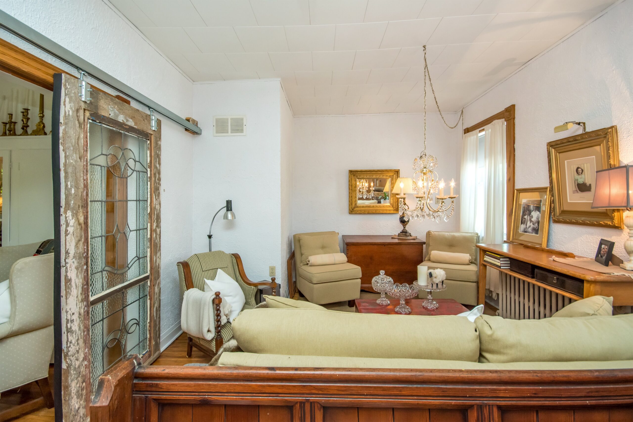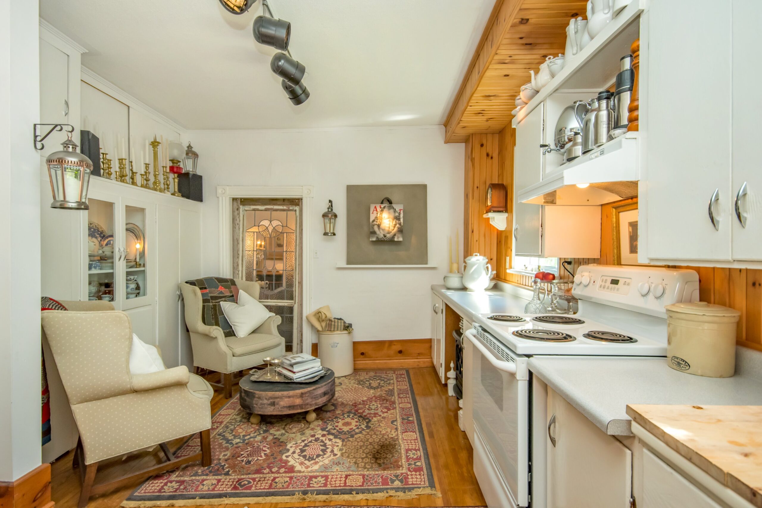 Kitchen/Dining Room – The kitchen has hardwood floors and opens into the living room via an antique leaded glass door.