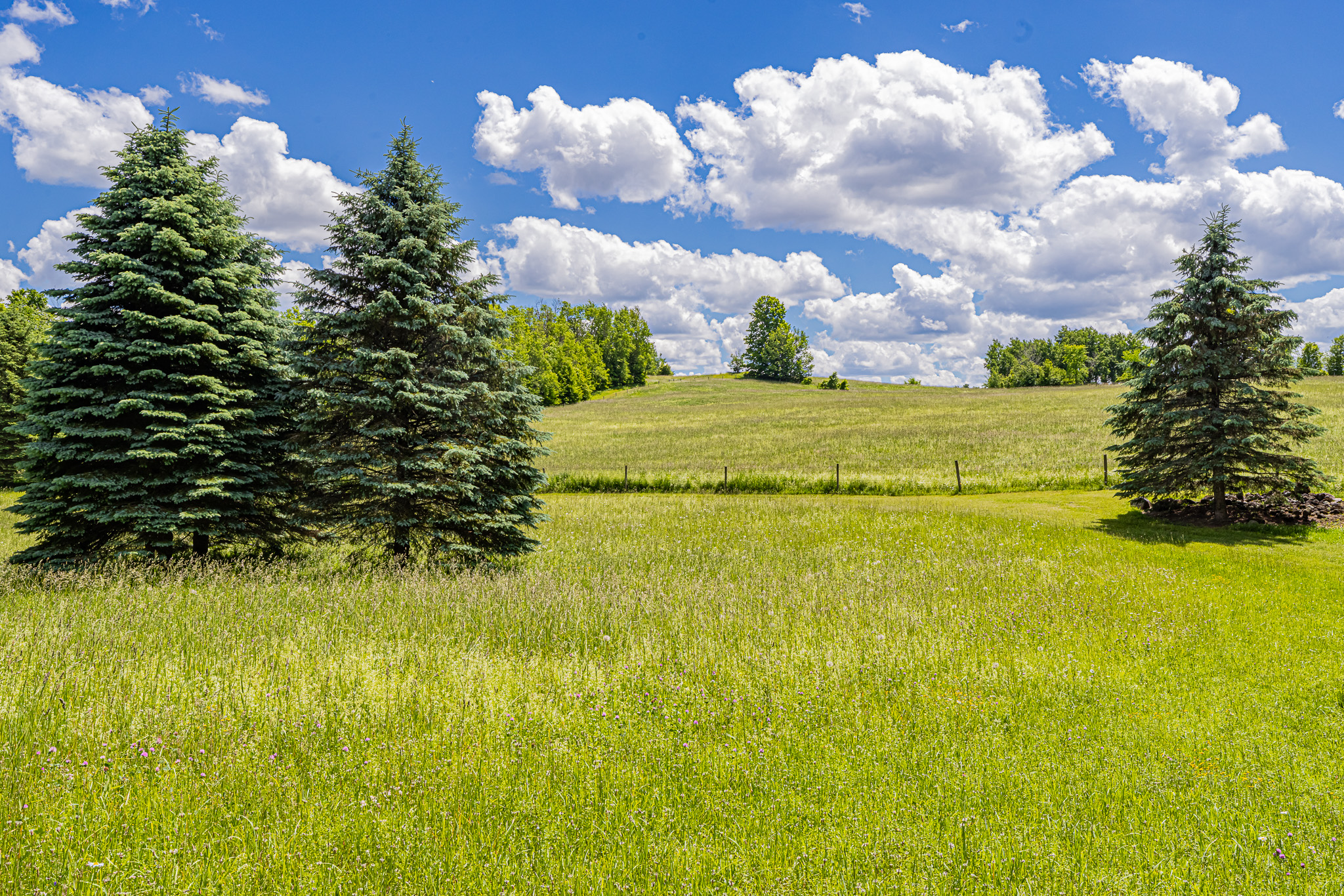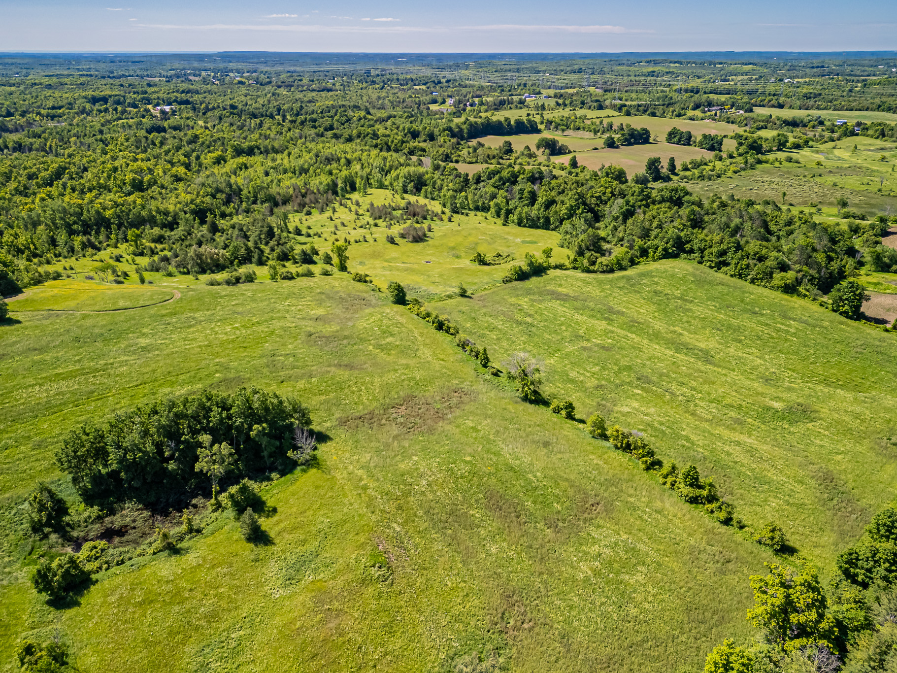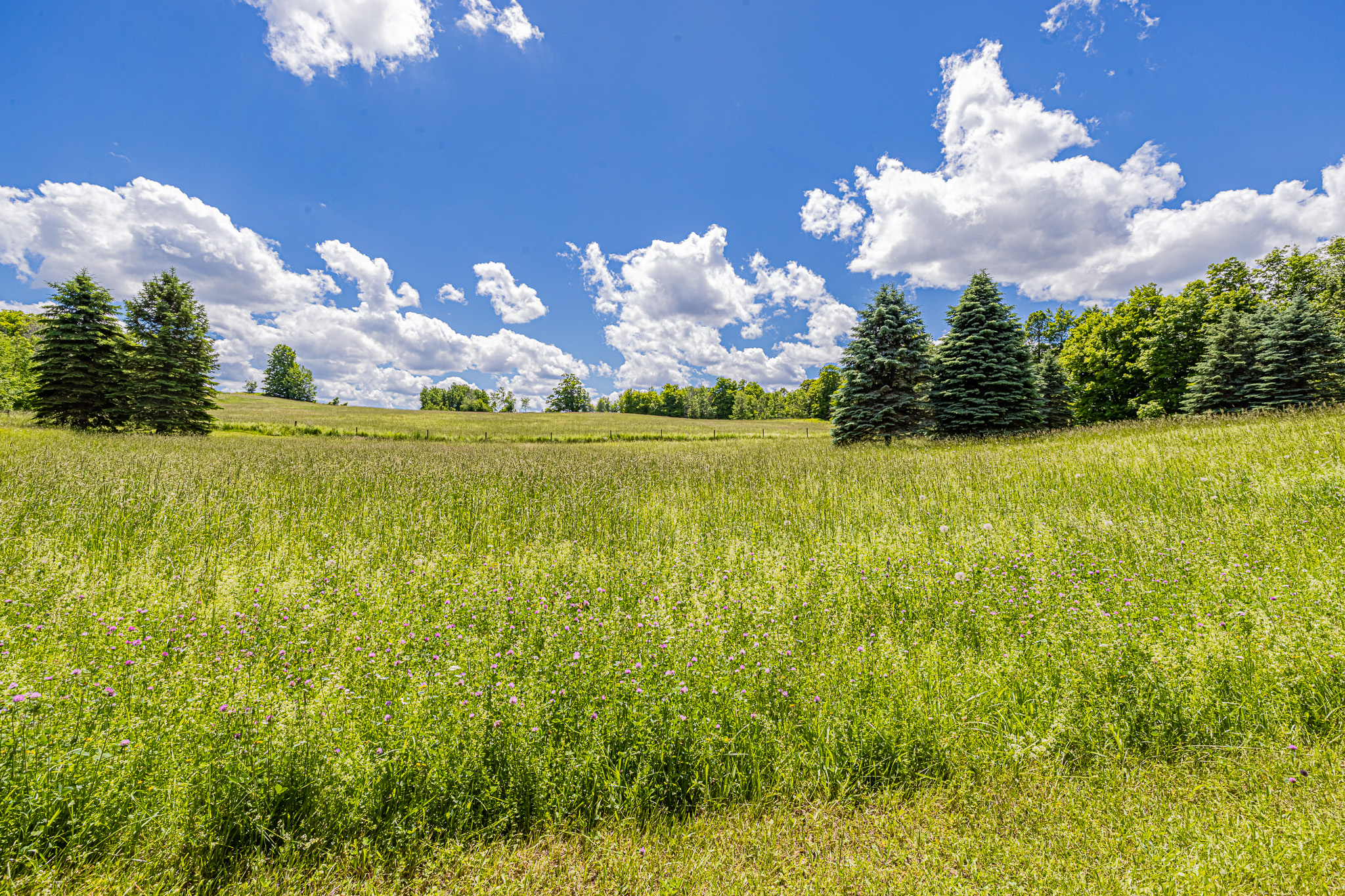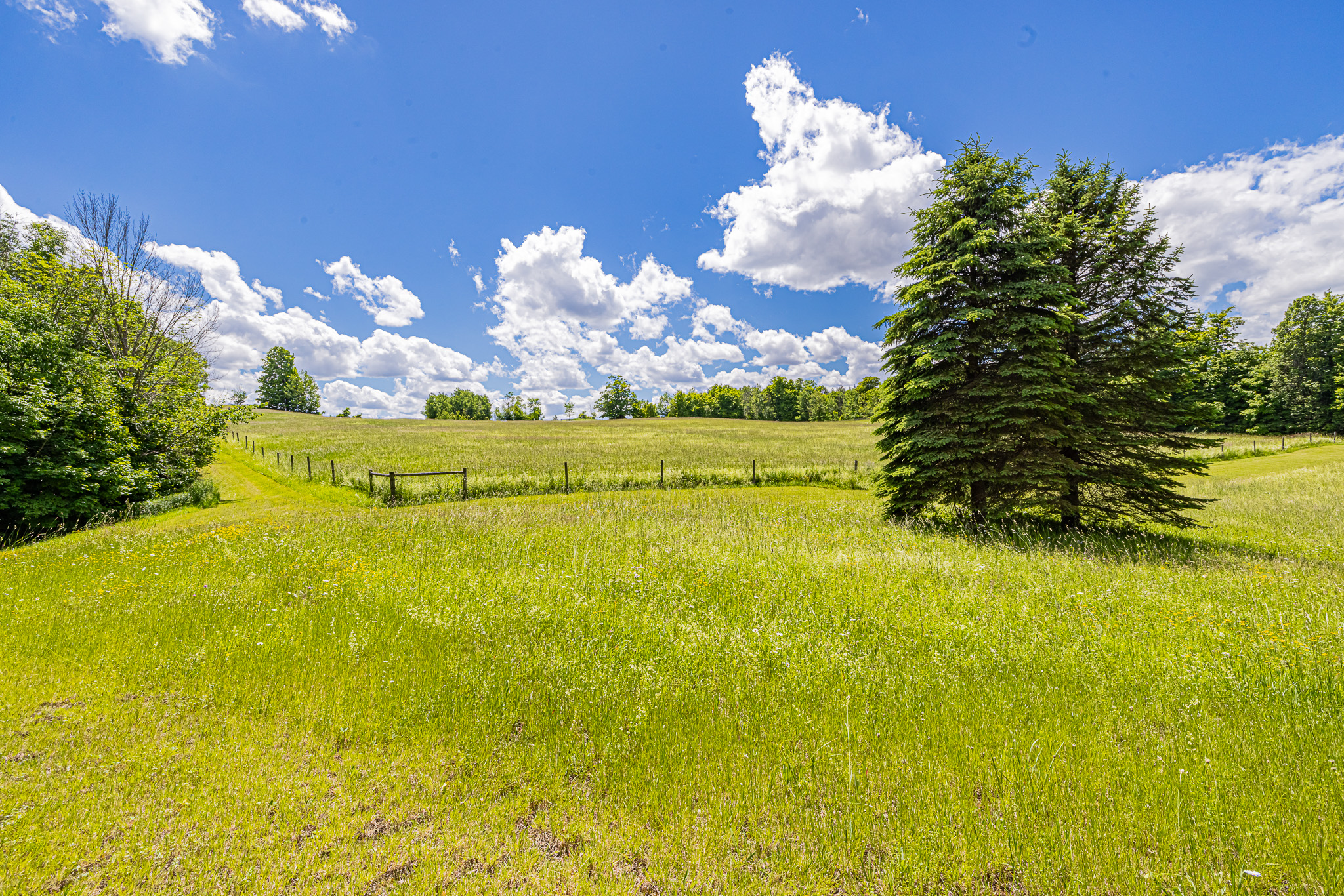 Over 50 acres with rolling hay fields and lovely woodlands with trails.