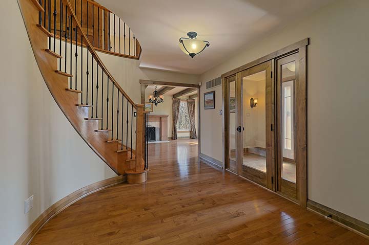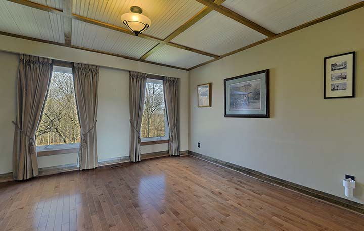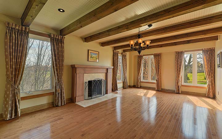 Well proportioned principal rooms, 3 fireplaces, hardwood floors, beamed ceilings and natural wood trim details throughout.