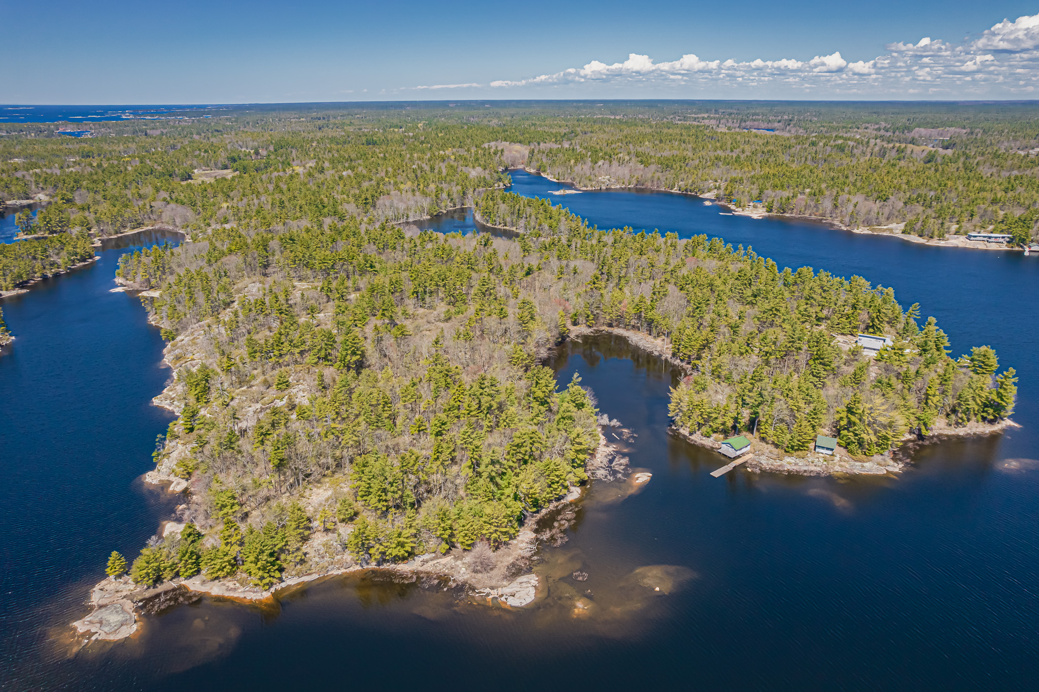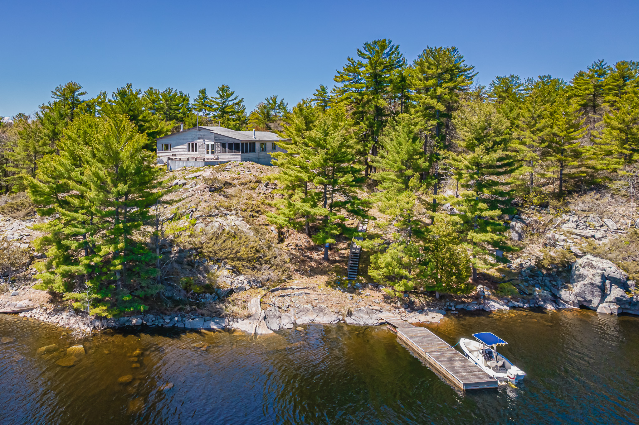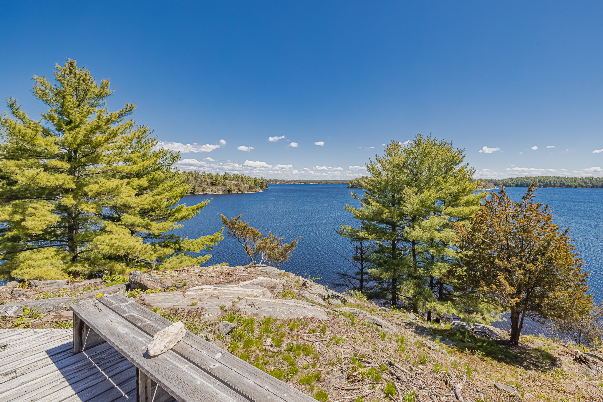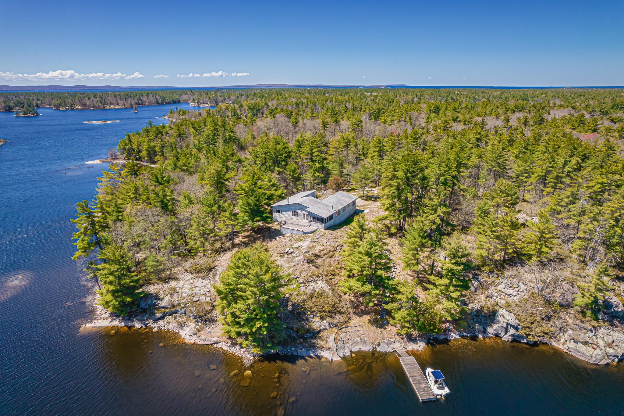 The 90+ acre peninsula situated north-west of Bone Island offers a unique mixture of undulating elevations, an abundance of forest, and various granite outcroppings. Flanked by 2 deep-water bays, the peninsula is private and untouched except for the cottage, a sleeping cabin and a dry boathouse located on the south east side of the property. Set back from the channel, you can relax on the deck, explore nature along the various walking trails or SUP along the shoreline.