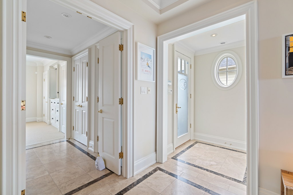Indulge in the luxuries of lakeside living with the beautiful stone gas fireplace and a large terrace, where you can relax and soak in the serene ambiance of the waterfront setting. The thoughtfully designed layout offers flexibility with two primary suites, one on each level. The main level primary suite boasts a lavish 5-piece ensuite bathroom featuring heated floors, a steam shower, and a jacuzzi bath, providing a spa-like retreat within your own home.