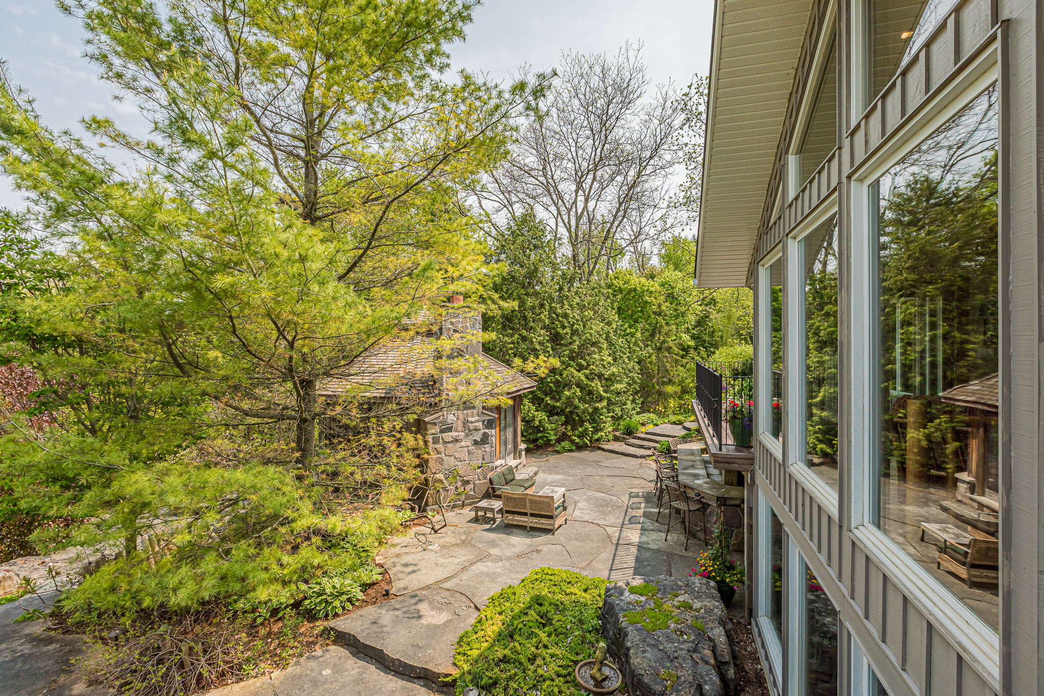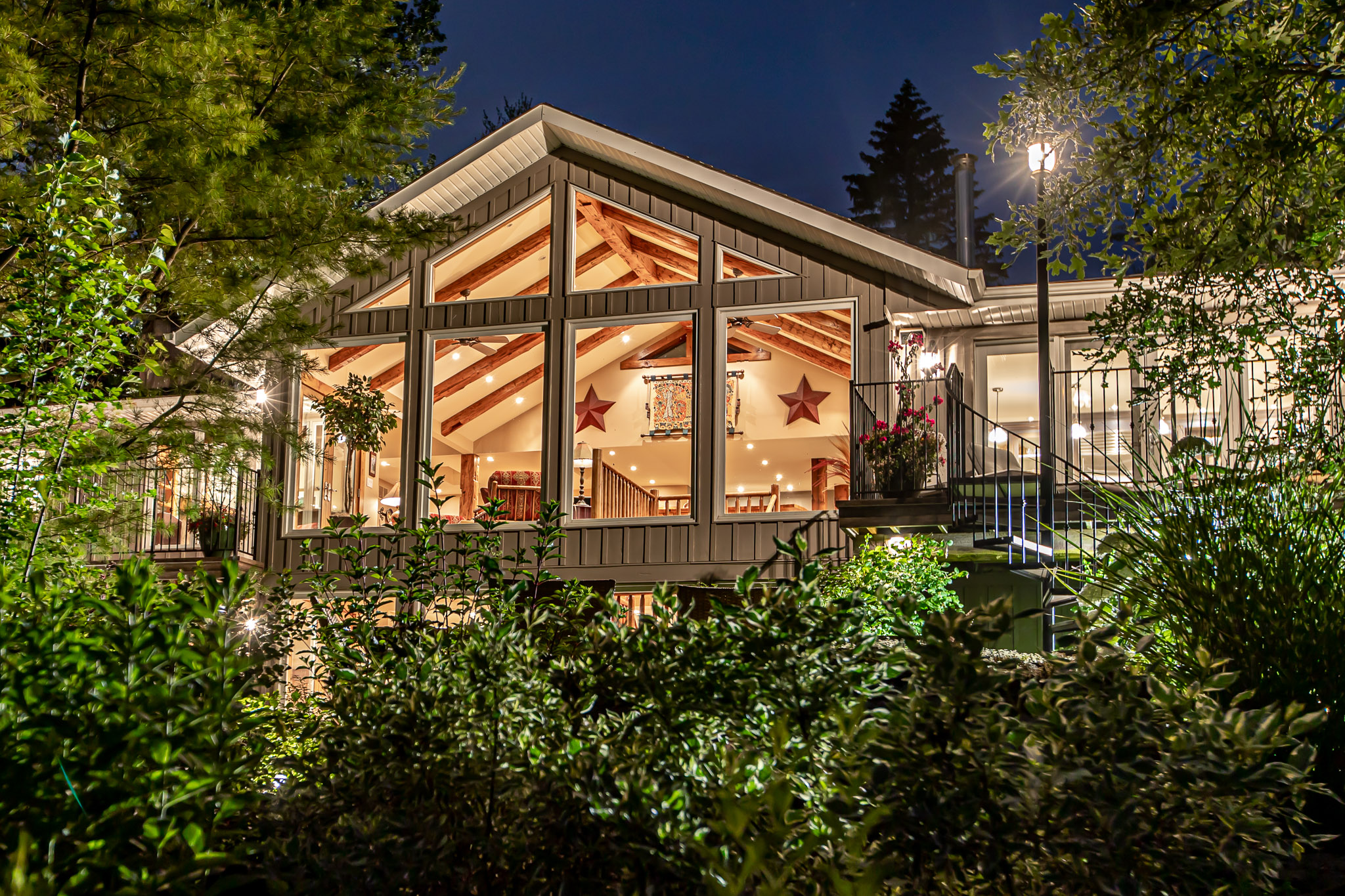 The unique, well-appointed 3+1 bedroom home features barn beams, reclaimed hemlock and stone floors, highlighted with dramatic floor-to-ceiling windows.