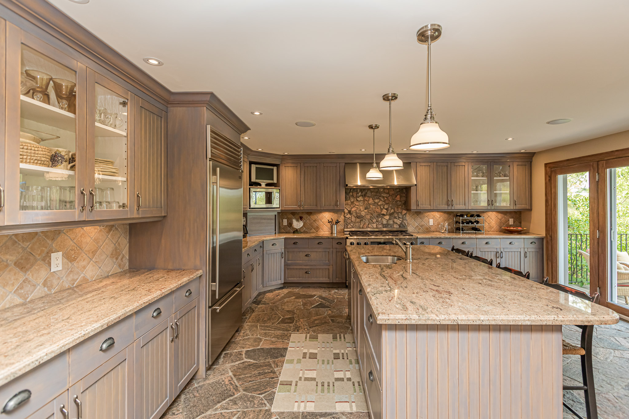 A custom kitchen with a large island flows into the family room with a stone fireplace and entrance to the deck to showcase the countryside view.