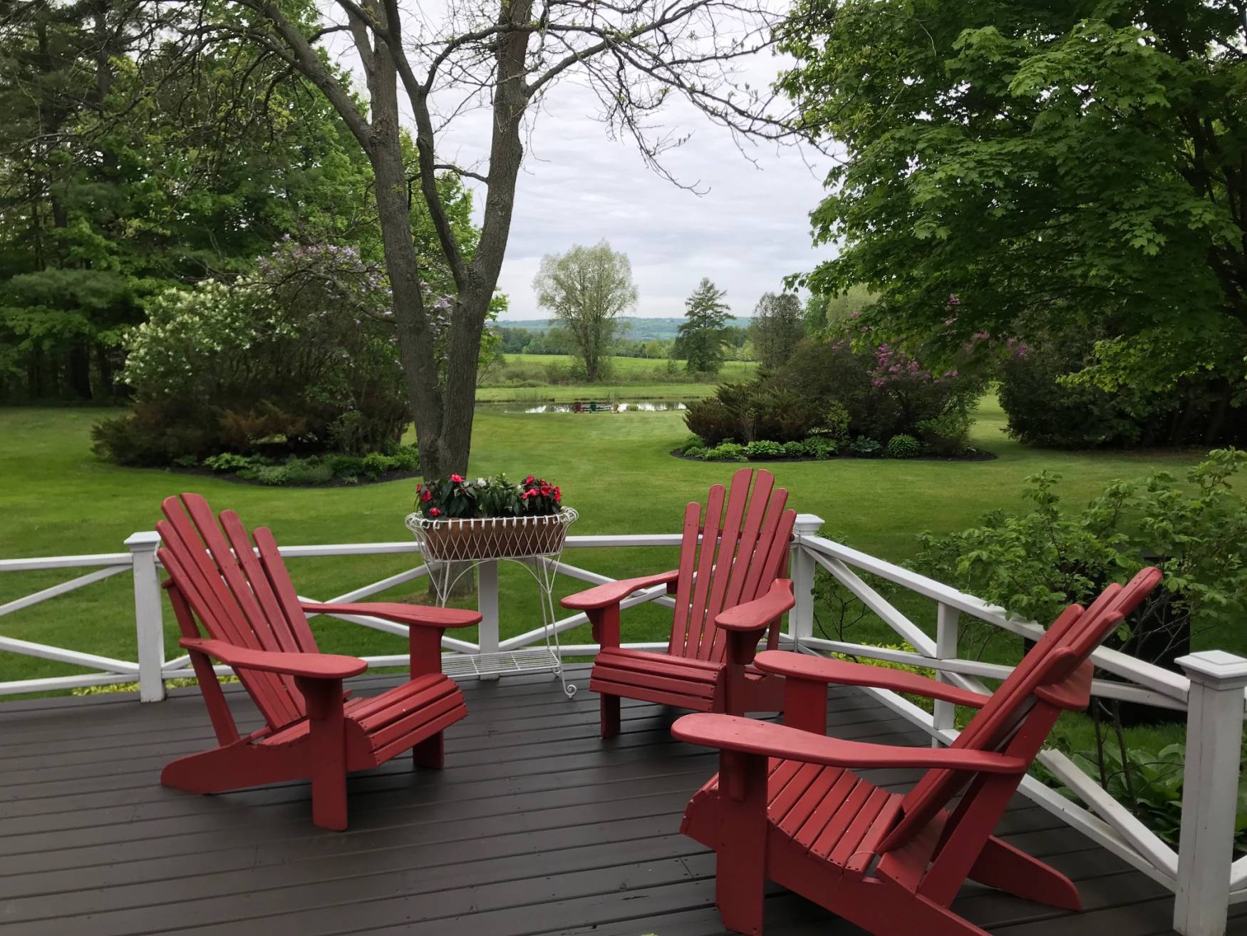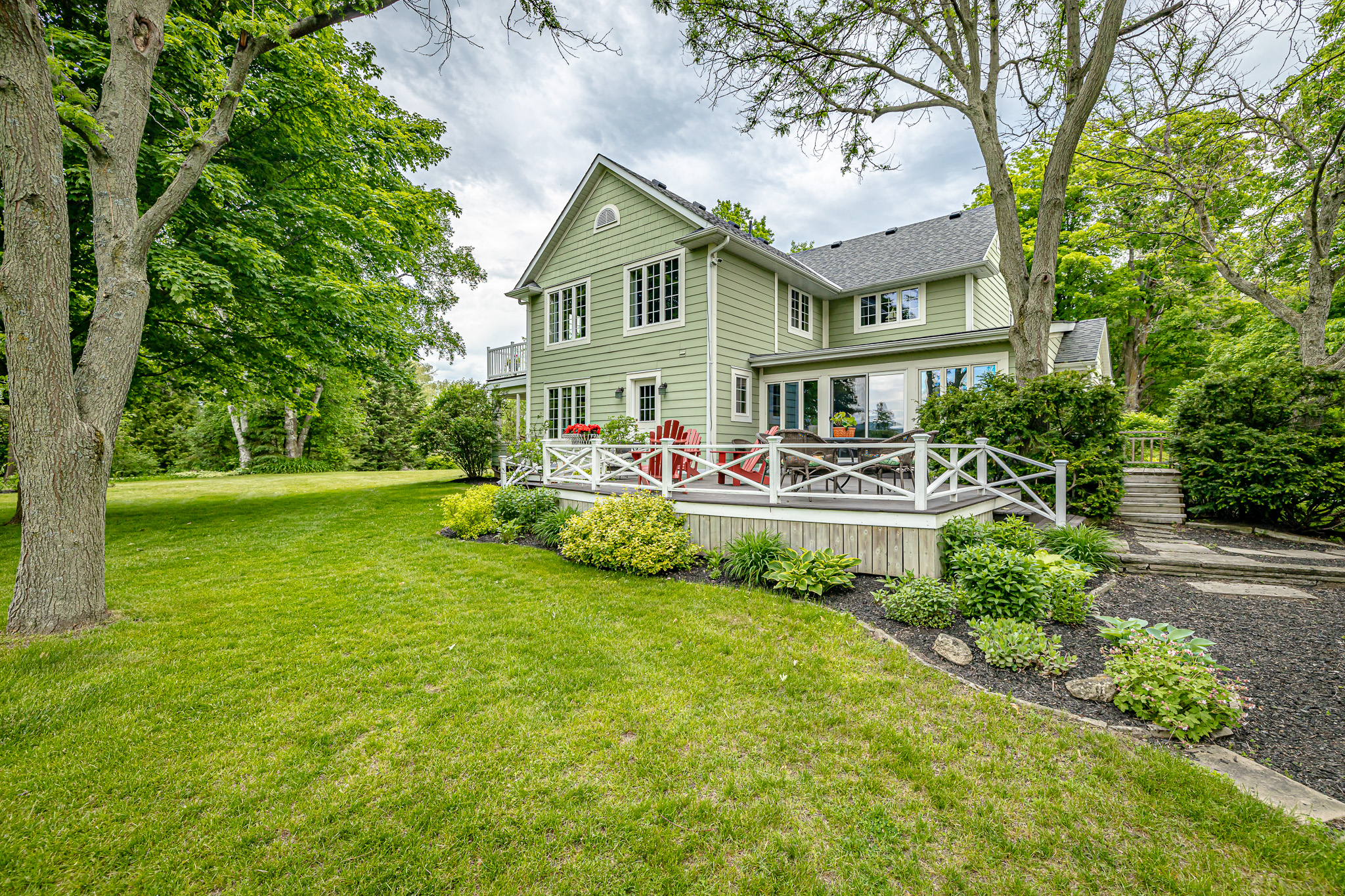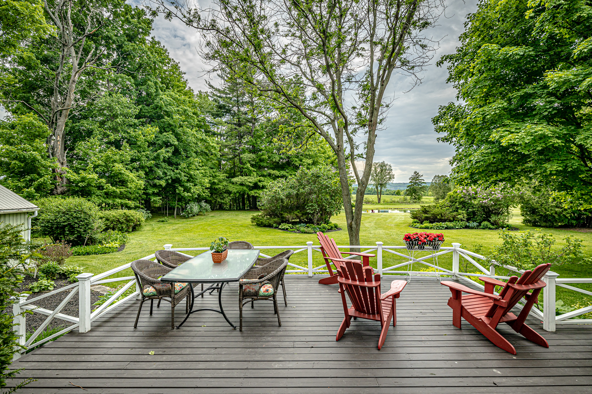 The western view from the living room is stunning! Vaulted ceiling with beams and a direct walk-out to an expansive deck that can accommodate very large gatherings. Enjoy the view towards the escarpment, the gardens, your own maple forest and the spring-fed pond in the distance.