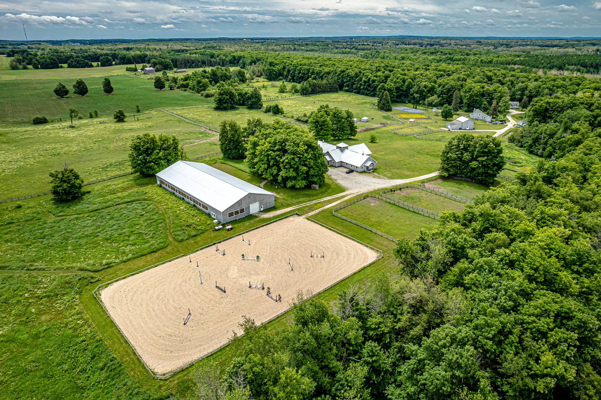 To the east of the main barn is the large (80×180 ft) and bright indoor riding arena with fibre footing. The arena has multiple entrance points and to the west of the building is an electrical hook-up for a camper.