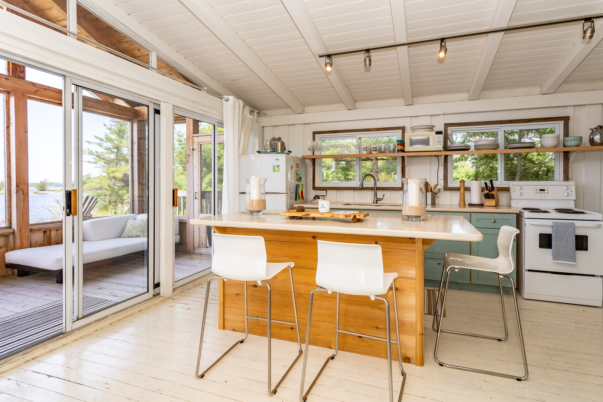 The cottage provides open concept living with the kitchen and living room as one, 2 bedrooms and a 3-piece bathroom. Maximizing the space, the addition of a wrap around, screened-in porch gives you the opportunity to bring the outdoors in with alfresco dining and numerous places to sit and relax while taking in the natural vistas.