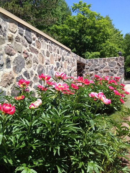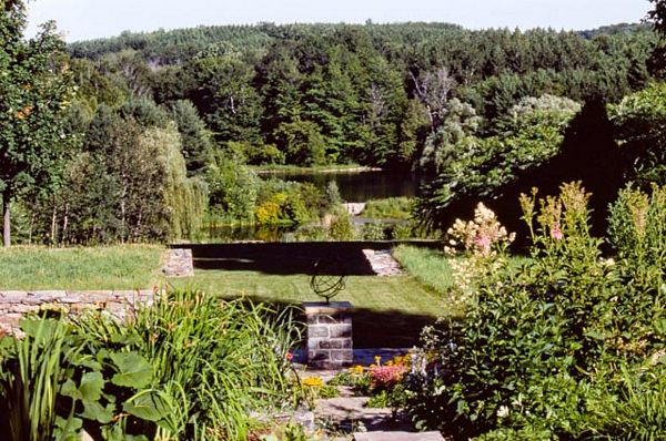The west façade of the home was created from fieldstone and the design follows the contour of the land down the hillside to the gardens and ponds.