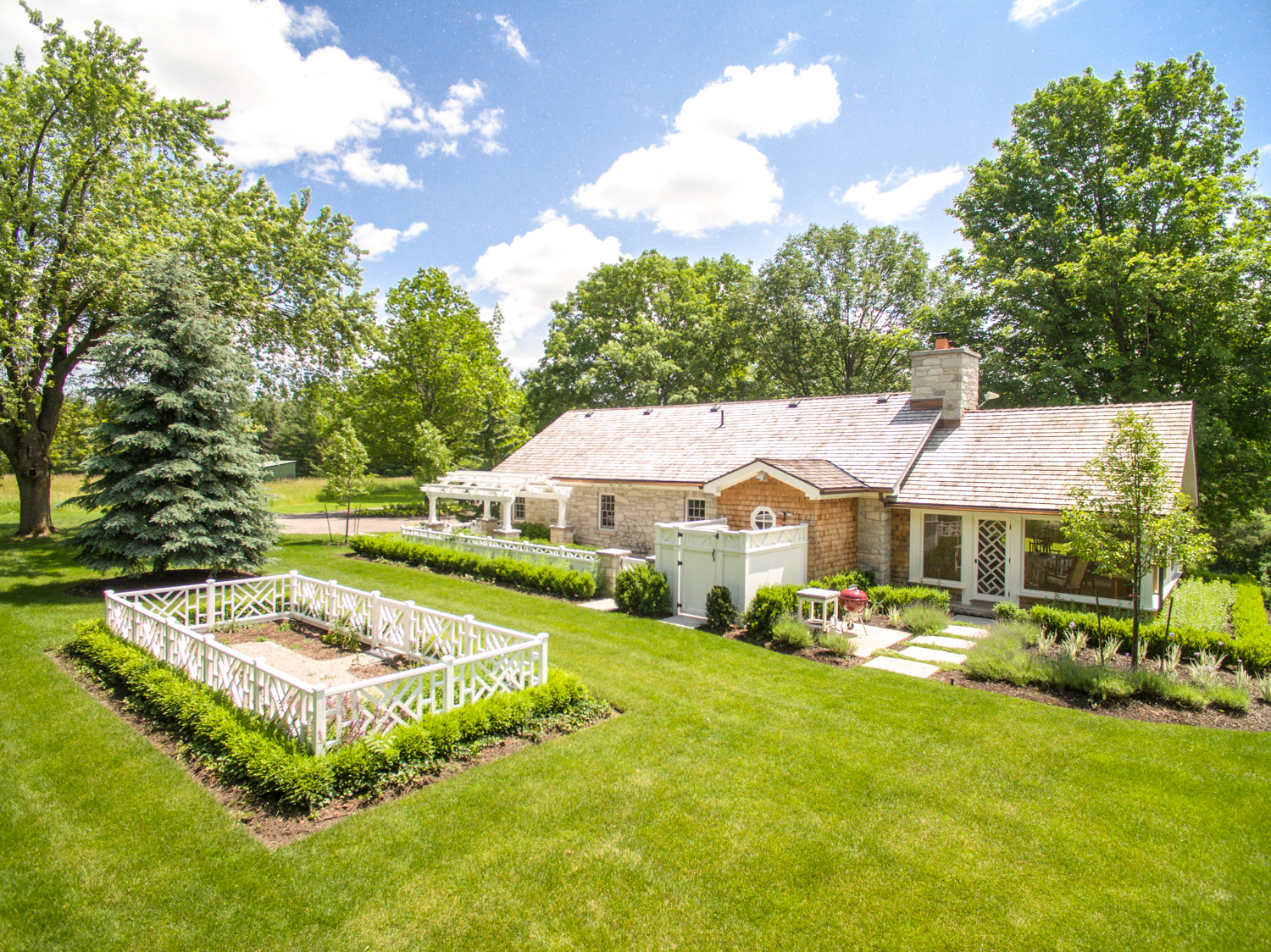 The original home was built overlooking the property with views to the south and west and near the pool and tennis court. This home could be renovated or a new home built in this ideal position. Trails lead down to the stream and towards the back fields and woodlands.