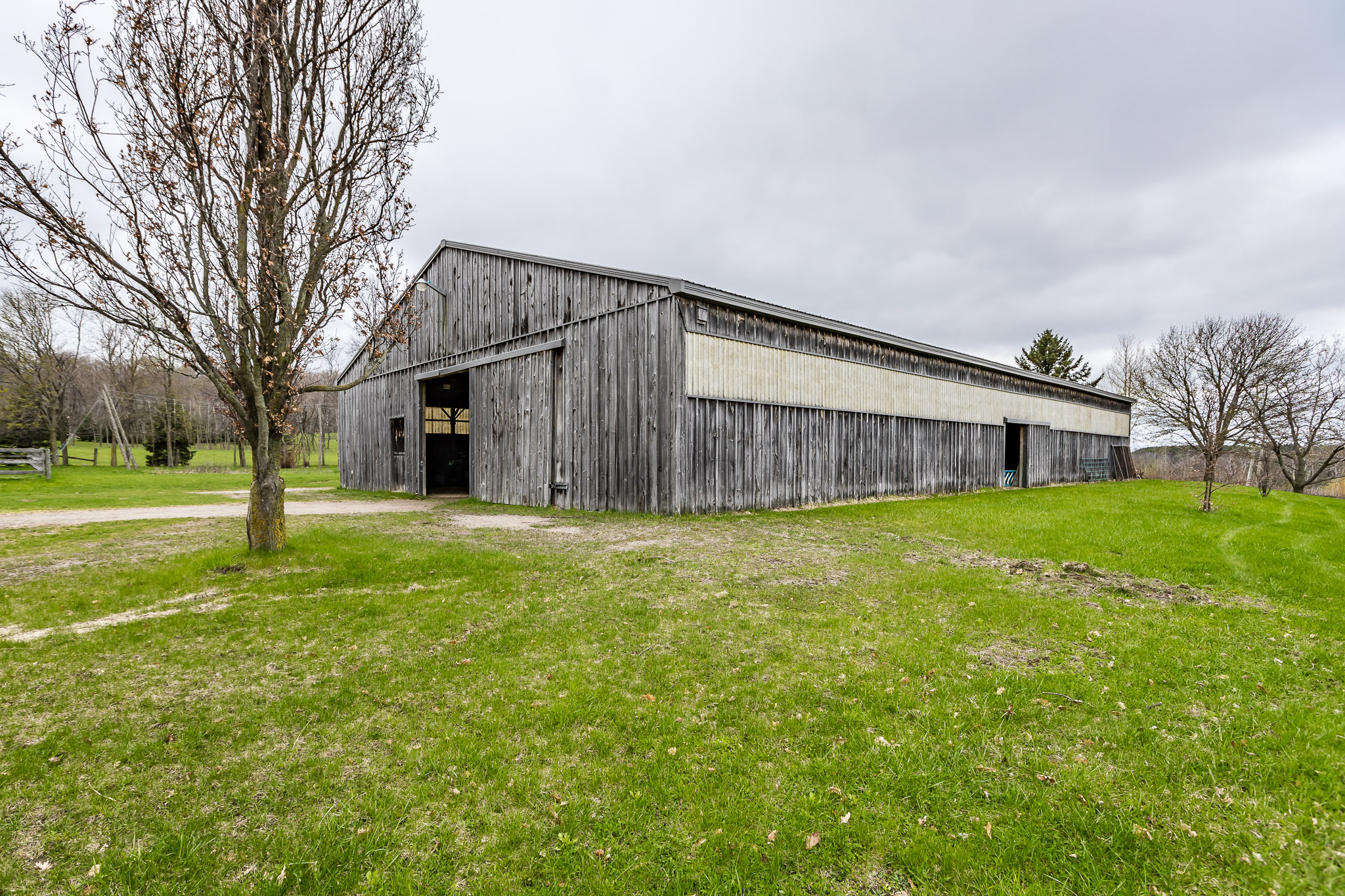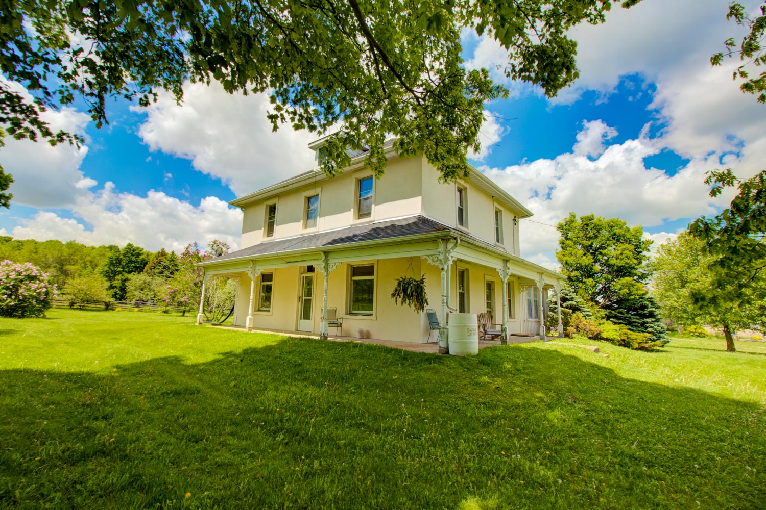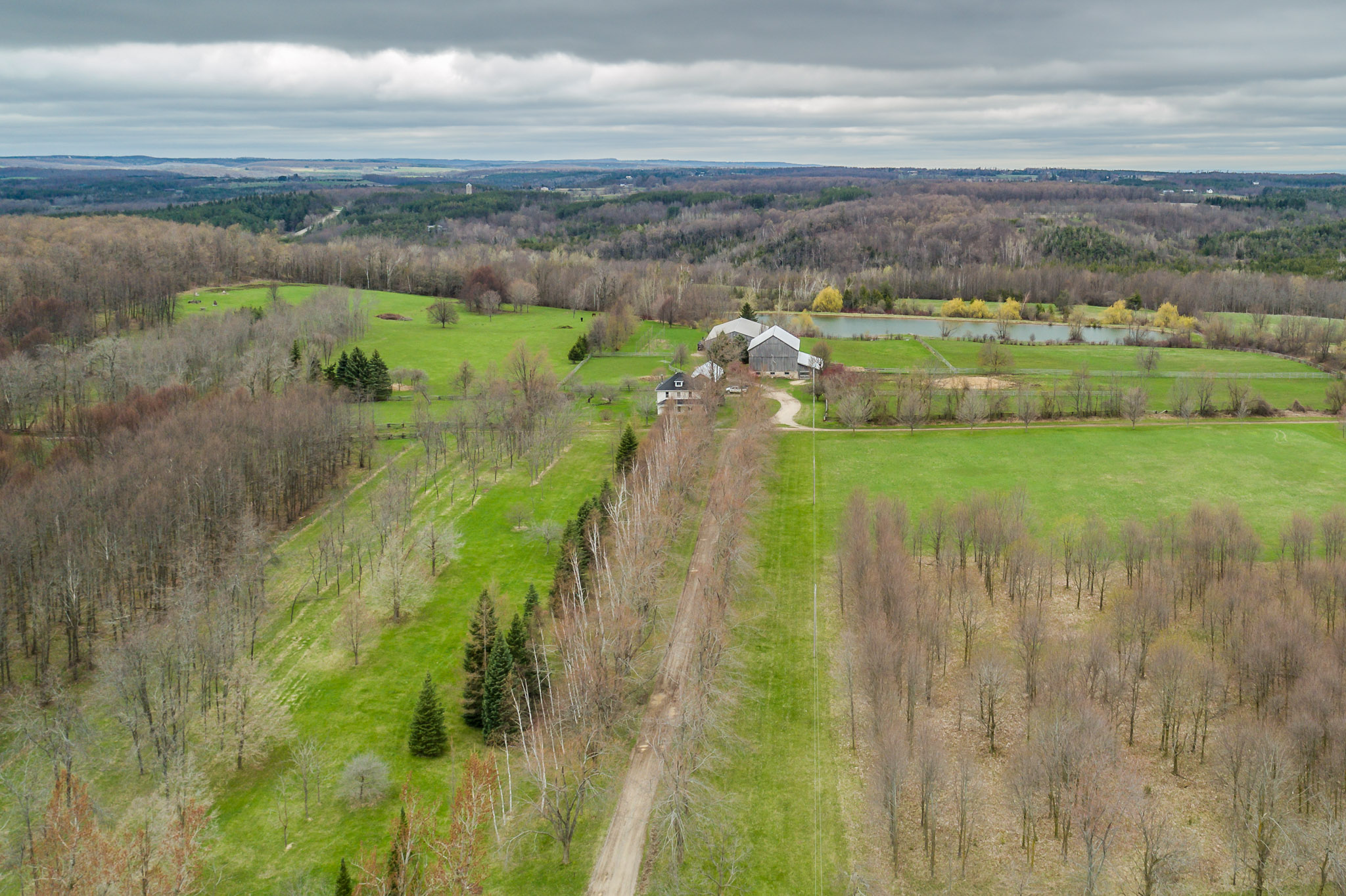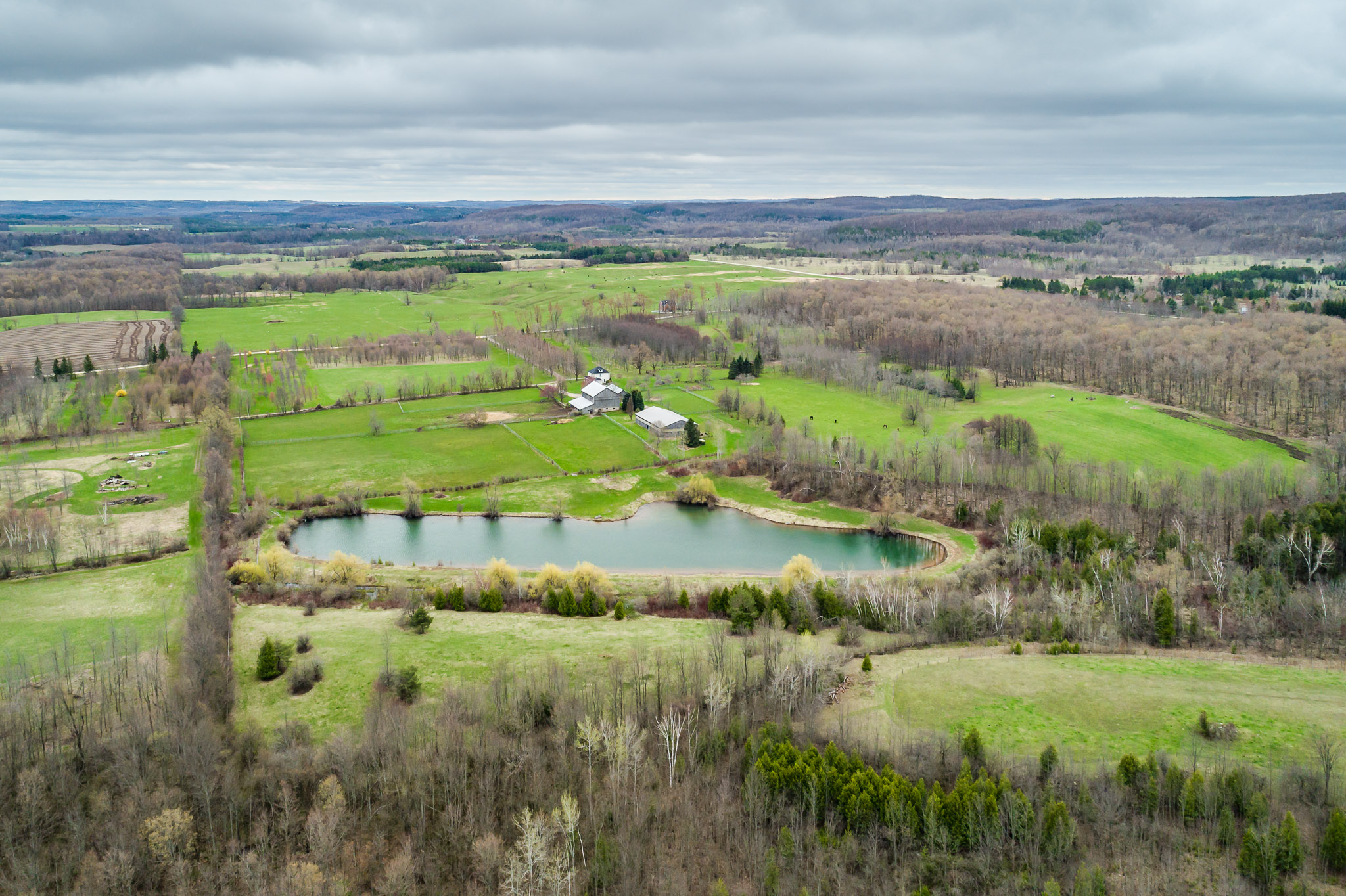 This is one of the most dramatic parcels of land we have seen in a long time! 100 acres set high atop the Hockley Valley. The long tree-lined driveway leads to a charming Ontario farmhouse & a well restored bank barn with field stone foundation. Just beyond the barn, is the 3 ½ acre crystal clear spring-fed pond. Near the barn is a cattle run-in shed and a 60 x 120 ft. indoor arena plus an array of fenced paddocks. Throughout the property is an impressive network of maintained hiking/riding trails which lead through the hardwood forests and over the property’s rolling hay fields. There is potential to build another home on this magnificent parcel of land!