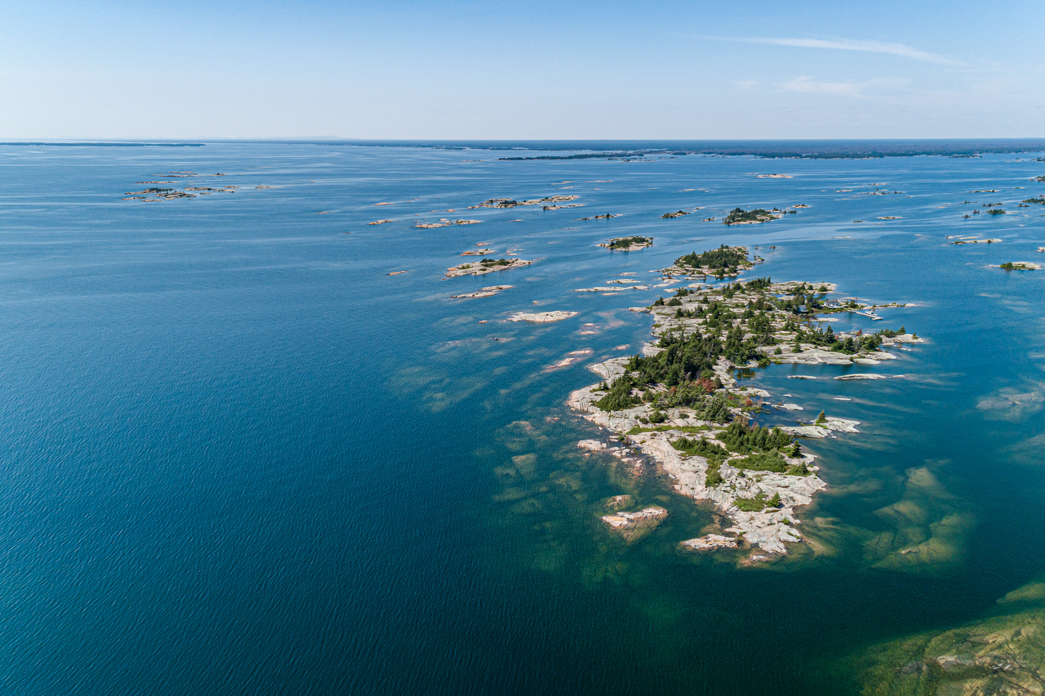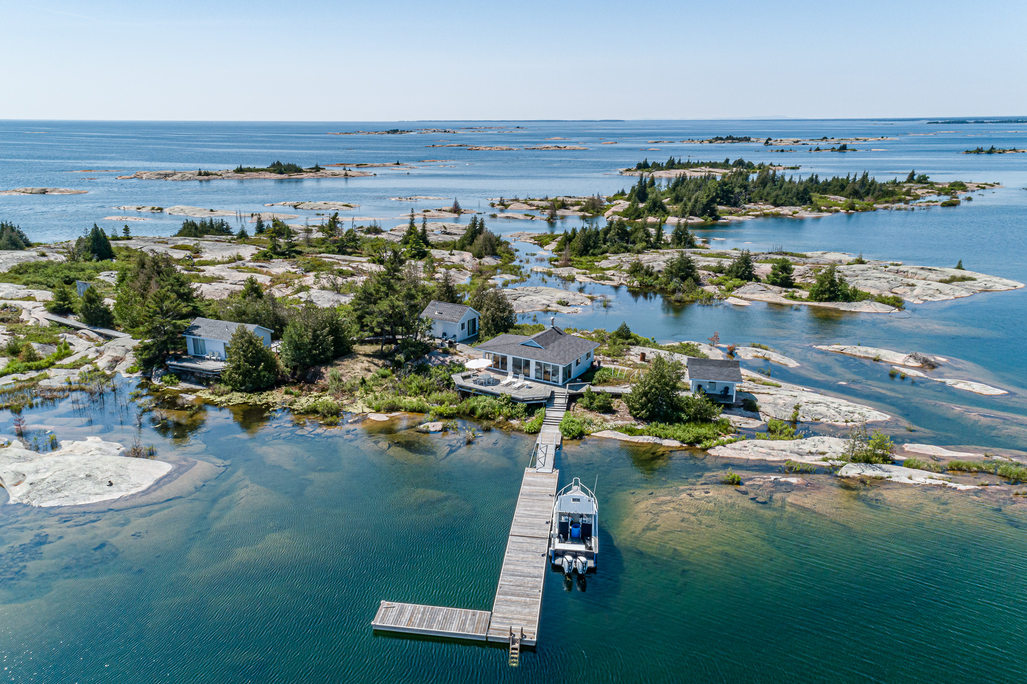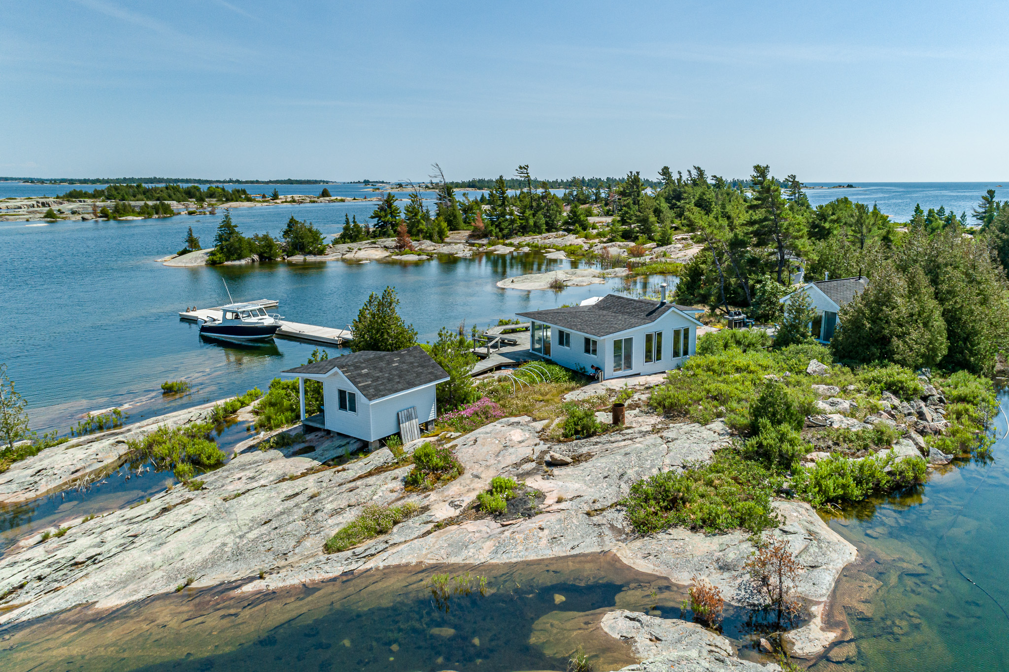 This private 14-acre island located south-west of Key Harbour is an absolute Georgian Bay Classic. Stunning views, crystal clear water & smooth granite. One of only a few privately owned outer islands in the area. An extensive L-shaped dock on the protected eastern side leads to a large deck & the original 600 sq. ft. 1 bedroom cottage. Three additional structures house 4 bedrooms & 2 bathrooms making it easy to entertain and accommodate 10 people. It’s off the grid and very well maintained. Wooden walkways connect the cabins and lead to a sitting area on the western side of the island where hours can be spent here taking in the open water views. Don’t miss this one! Unlimited Building Opportunities as the island is located in an unorganized township. The Island is already severed into 2 seven-acre parcels creating additional value for growing families and generational planning.
