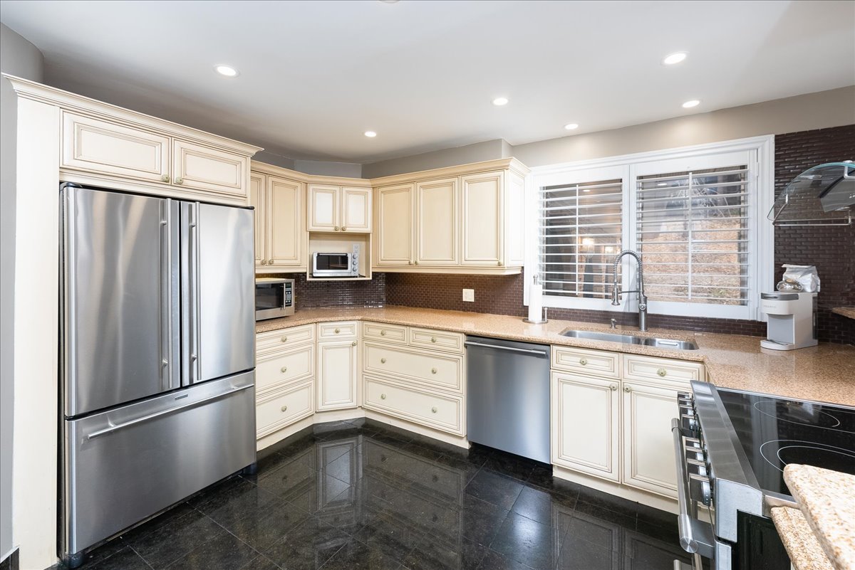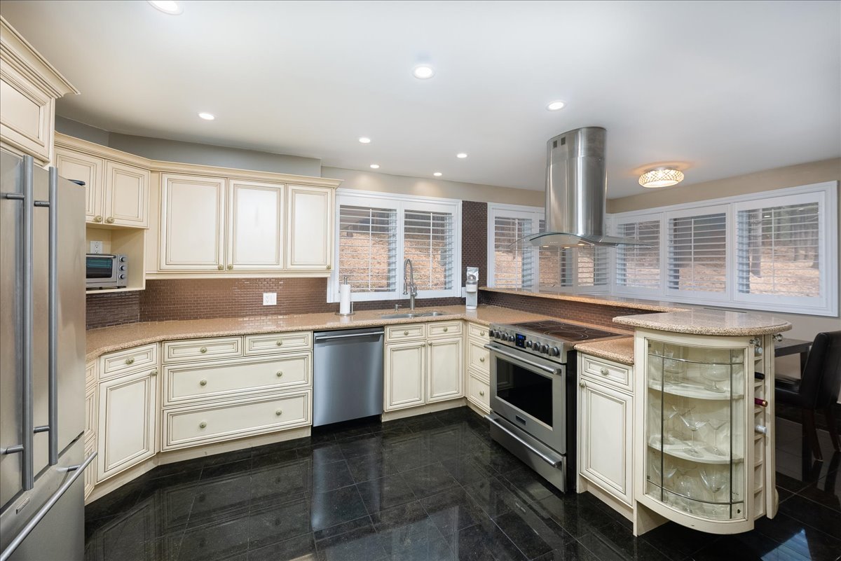 Large custom kitchen with eat-in area and stainless steel appliances.