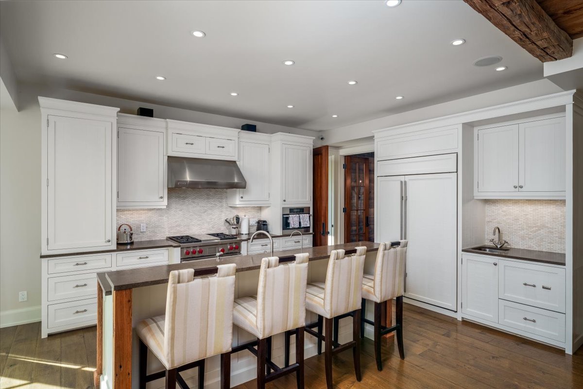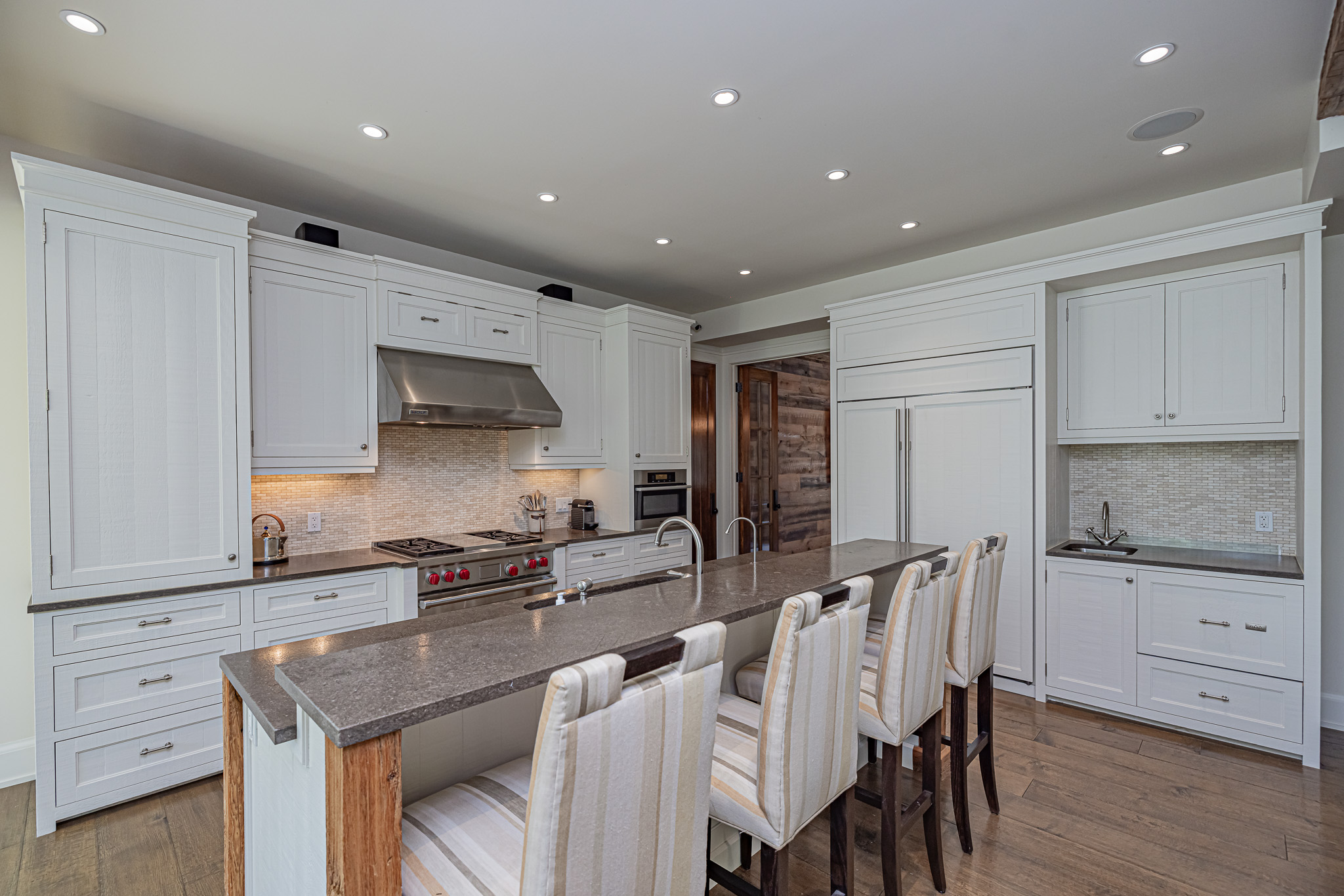 Located in the centre of the home, the kitchen is combined with the living room. The over-sized fireplace, beamed ceiling and views to the east make this a wonderful space. The kitchen has top-of-the-line appliances, multiple prep spaces and breakfast bar.