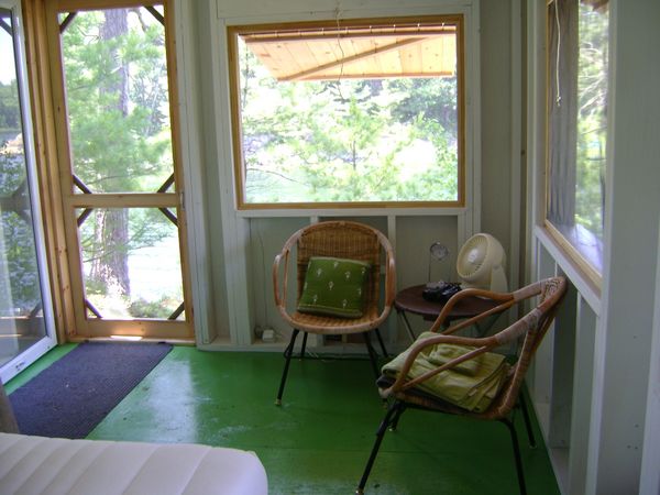 The screened porch has a conversation area overlooking the South Channel and a pull out day bed which create a second sleeping area. Pull down canvas flaps allow for enjoyment of the porch in all weathers.