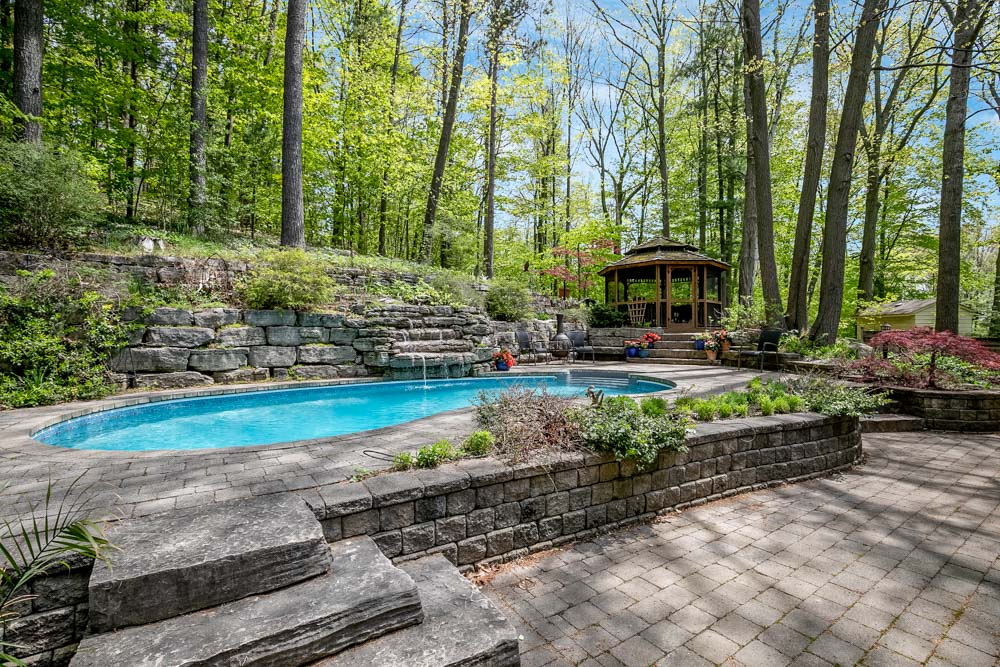 One of a kind custom home on private forest 1/2 acre lot in Midhurst. Beautifully maintained, with approximately 3500 sq. ft., this 4 bedroom, 4 bathroom home is truly unique.  Gray cultured stone and stucco on the exterior and tiered gardens, stone patios and a kidney shaped pool maximize the outdoor space. The theme of “bringing the outside in” continues with a custom award-winning kitchen featuring a solarium overlooking the backyard. A curved kitchen that incorporates natural elements of bamboo, glass and granite is the heart of the home. Two living rooms and a dining room make it an entertainer’s delight. The master bedroom with a fireplace and beautiful ensuite provides luxury and ensures privacy. At the other end of the house are two bedrooms and a 4-piece bathroom. Downstairs features a rec room, two bedrooms or one bedroom and an office, a 3-piece bathroom, a separate laundry room, a tool room, a mudroom and 2 different entry points to the oversized two-car garage.  Few details have been overlooked in this well-appointed home. Steps to extensive trail system and parks. Minutes to Forest Hill Public School and a short drive to Hwy 400.