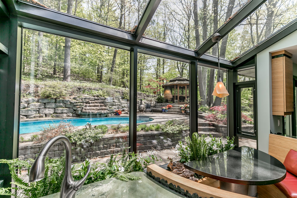 • Custom Kitchen designed by Total Concept Living features a solarium with bay windows, a custom breakfast bar & indoor garden, curved counters, a curved island and even a curved desk all facing the solarium. Counter tops are black granite and Verde bamboo granite. Bamboo cabinets and drawers. Under lighting, 15 pot lights and track lighting create a beautiful nighttime ambience. Award winning, featured in magazines