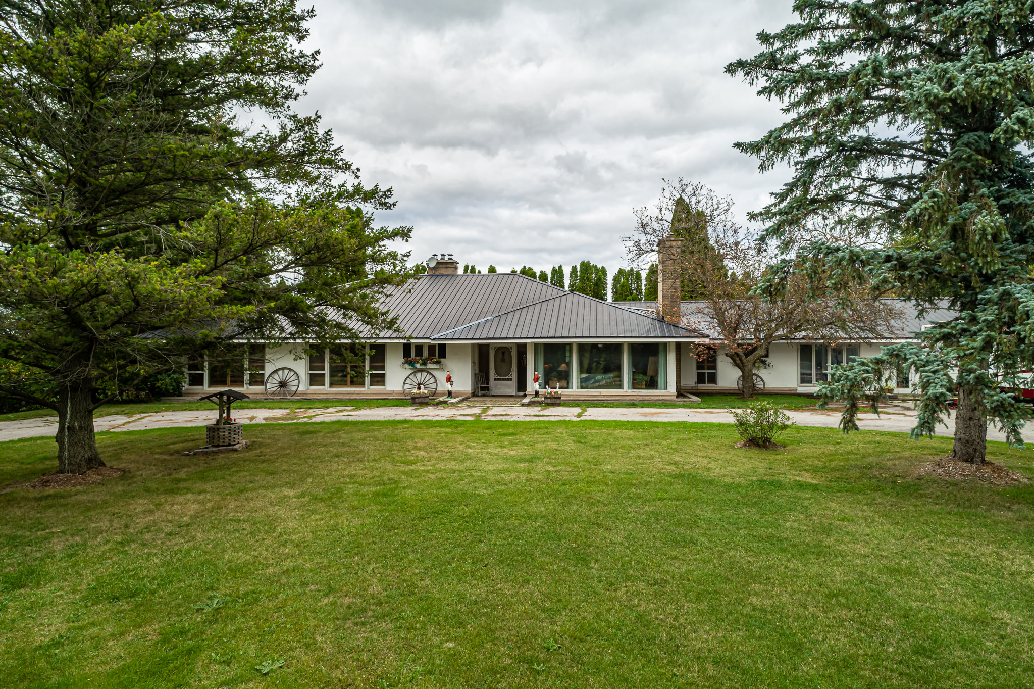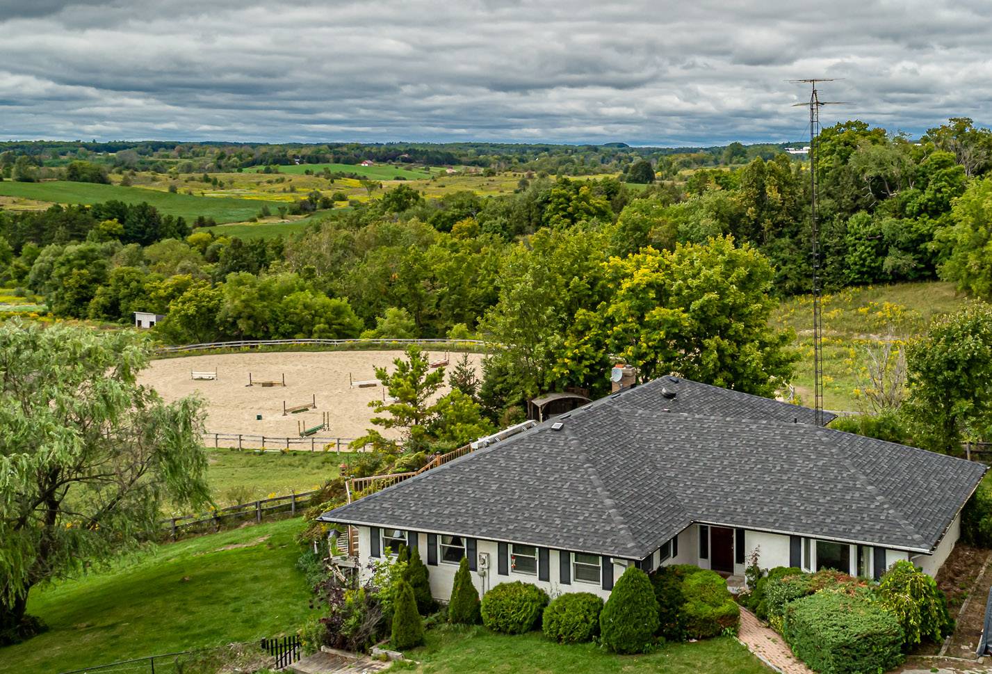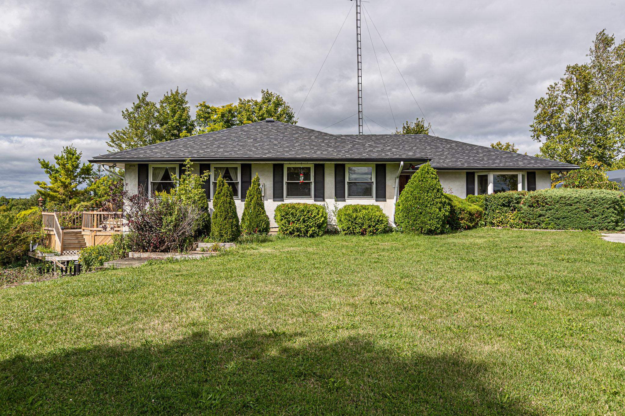 Sited on a high point of the property with long western views is a walk-out bungalow. The main floor has 3 bedrooms with 2 full bathrooms plus a large family room, eat-in country kitchen and large formal dining room. The master suite has a 5-piece en suite bath and walk-in closet plus a direct walk-out to the wrap around deck.