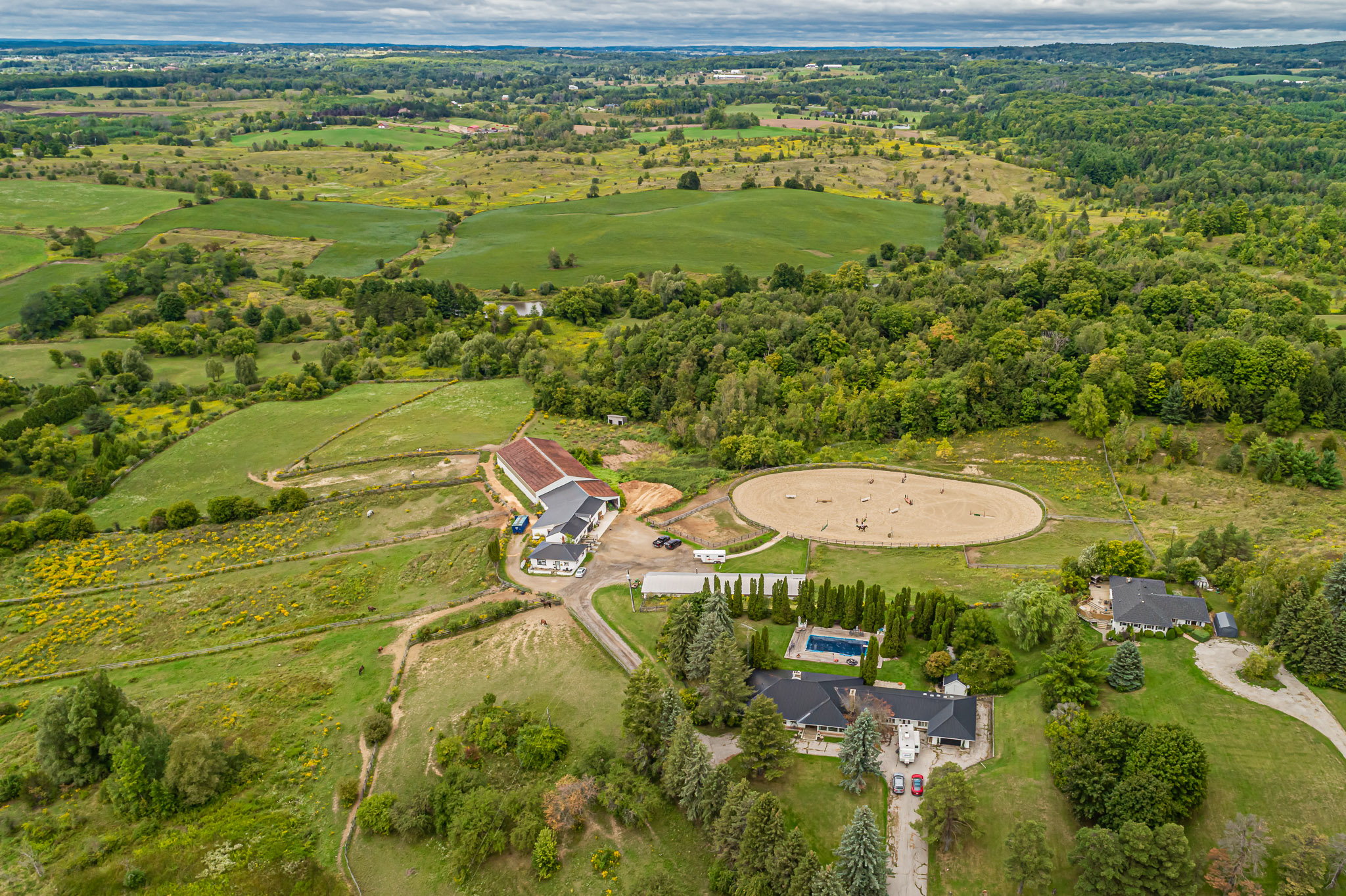 Currently, there are 3 complete staff houses to support the horse facility. One unit is 2 bedroom/1.5 bathroom home with laundry and office. The two other units are 1 bedroom/1 bathroom with kitchen & living space.