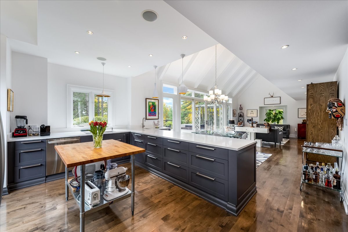 The main floor great room has soaring ceilings and oversized walk-out sliding doors which open onto the main deck and grounds. The expansive use of glass including the transom windows floods the space with natural light. The custom kitchen with large breakfast bar, window bench & views over the front garden area is combined with the great room. This living, dining and kitchen space also has a wood burning fireplace.