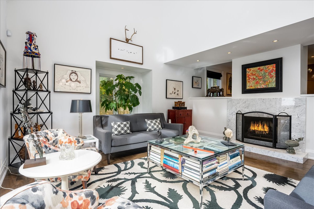 The main floor great room has soaring ceilings and oversized walk-out sliding doors which open onto the main deck and grounds. The expansive use of glass including the transom windows floods the space with natural light. The custom kitchen with large breakfast bar, window bench & views over the front garden area is combined with the great room. This living, dining and kitchen space also has a wood burning fireplace.