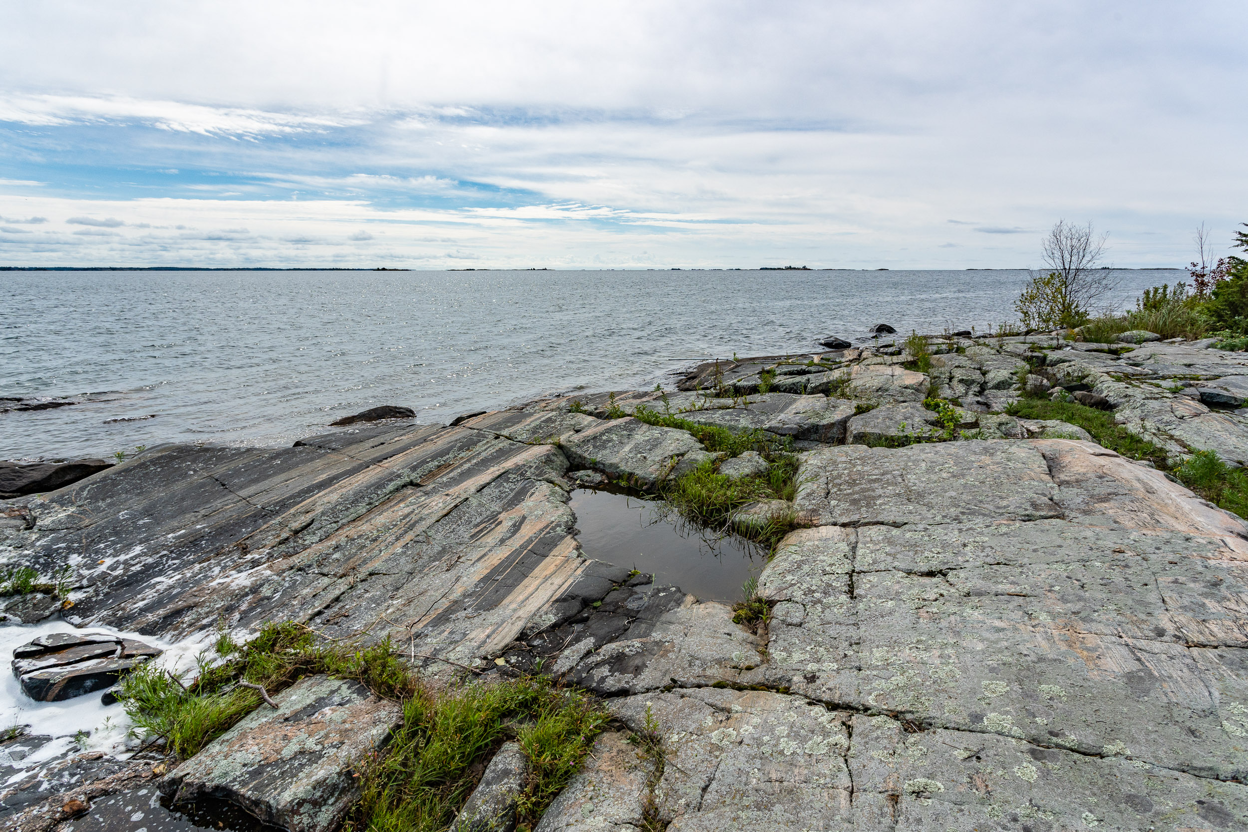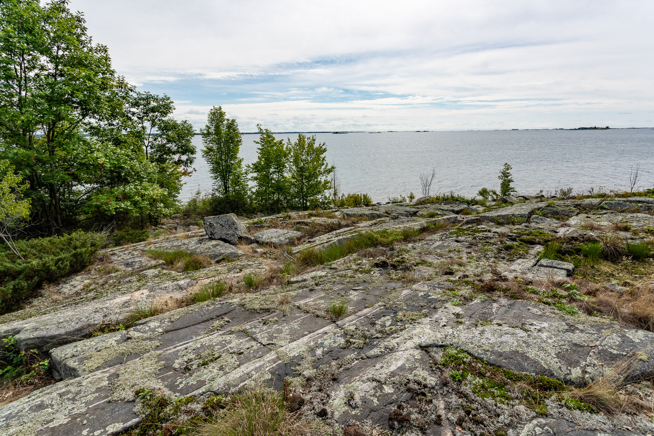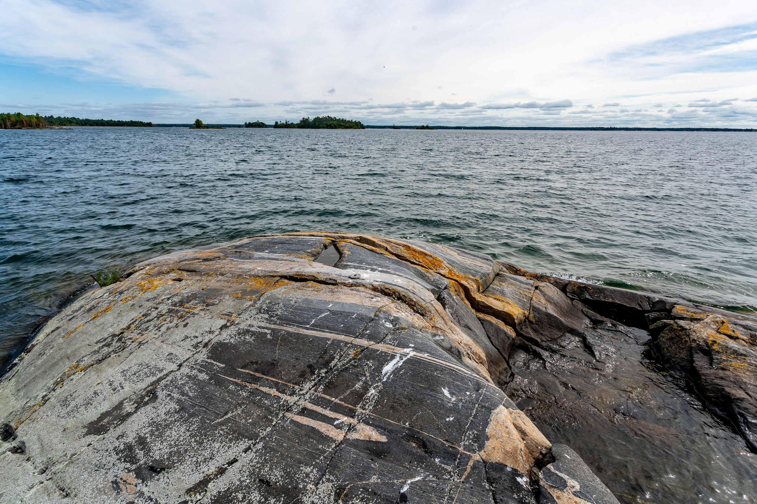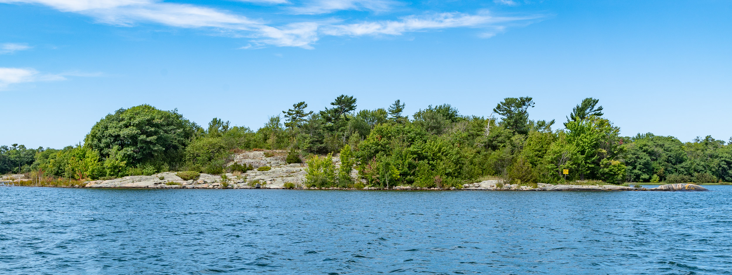 The land is a mixture of trees and open rock surrounded by clear water with a sandy bottom.