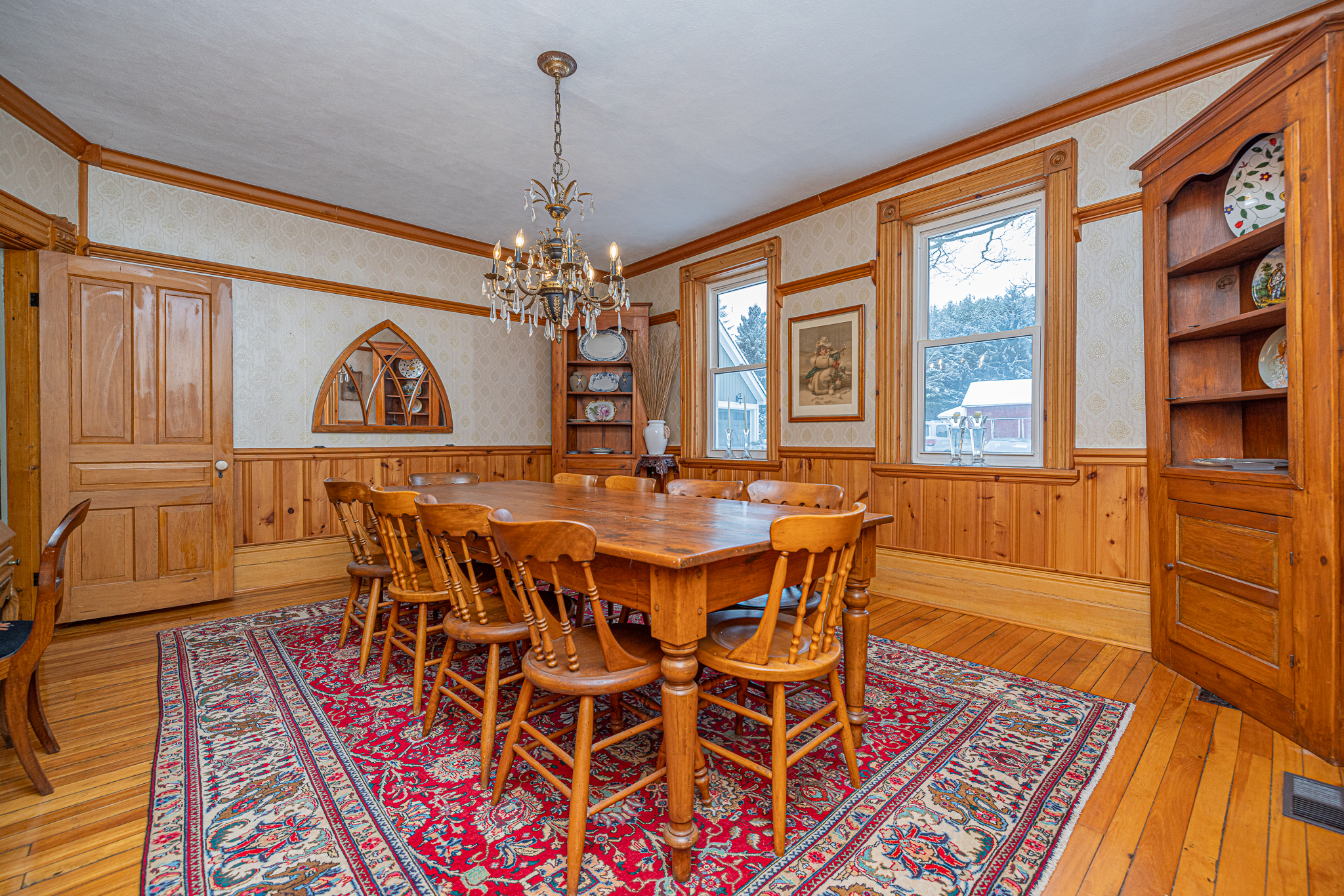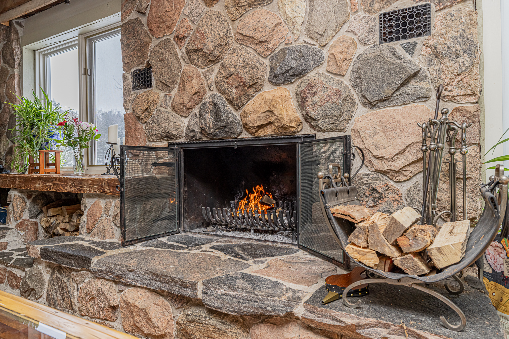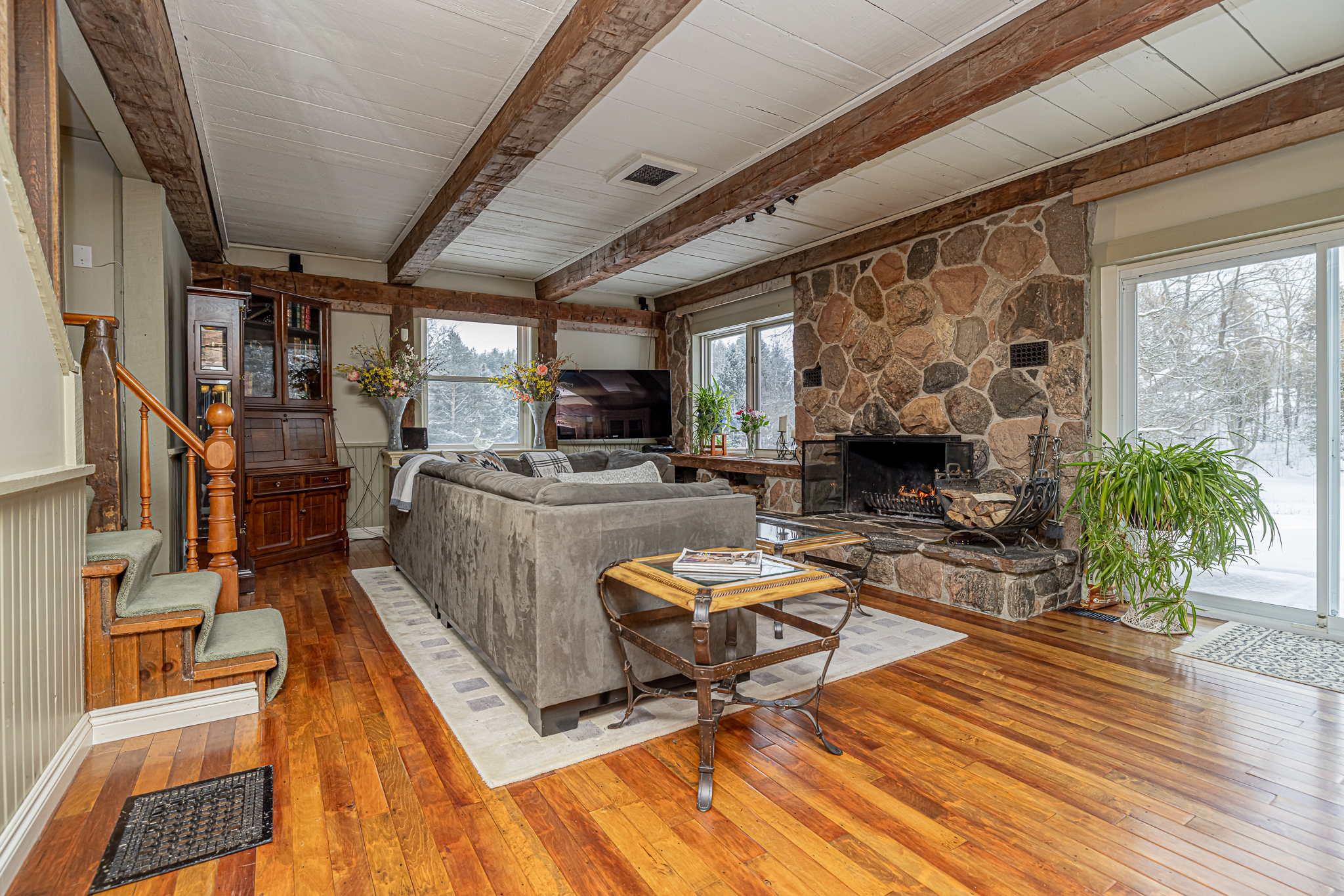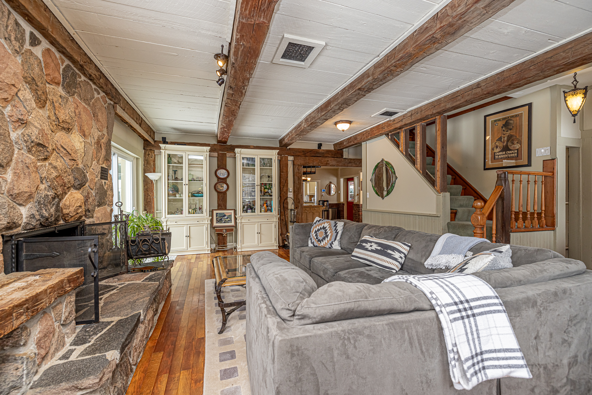 At the heart of the property sits a beautifully preserved century farmhouse that effortlessly blends heritage features with rustic warmth. Original wood beams, wide plank floors, and a stunning granite floor-to-ceiling fireplace are complemented by a 1909 Corona wood cookstove, creating a cozy and inviting interior with five spacious bedrooms and plenty of character throughout.