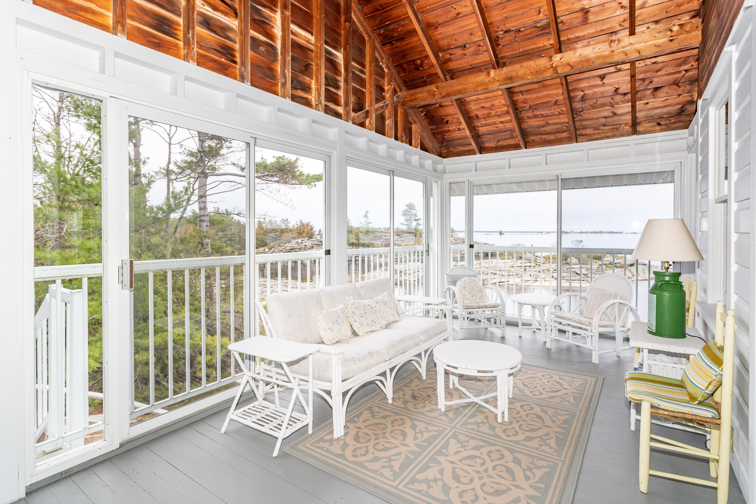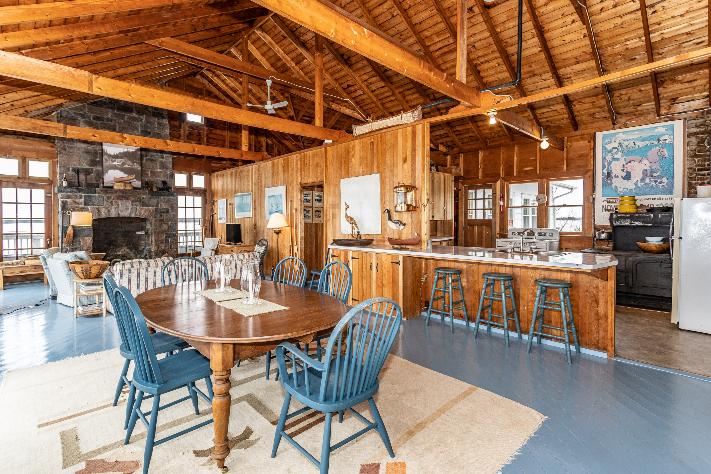 The 1950s cottage is a Georgian Bay classic with open rafters, a 2 storey stone fireplace and wall of western facing doors and windows to capture the view.