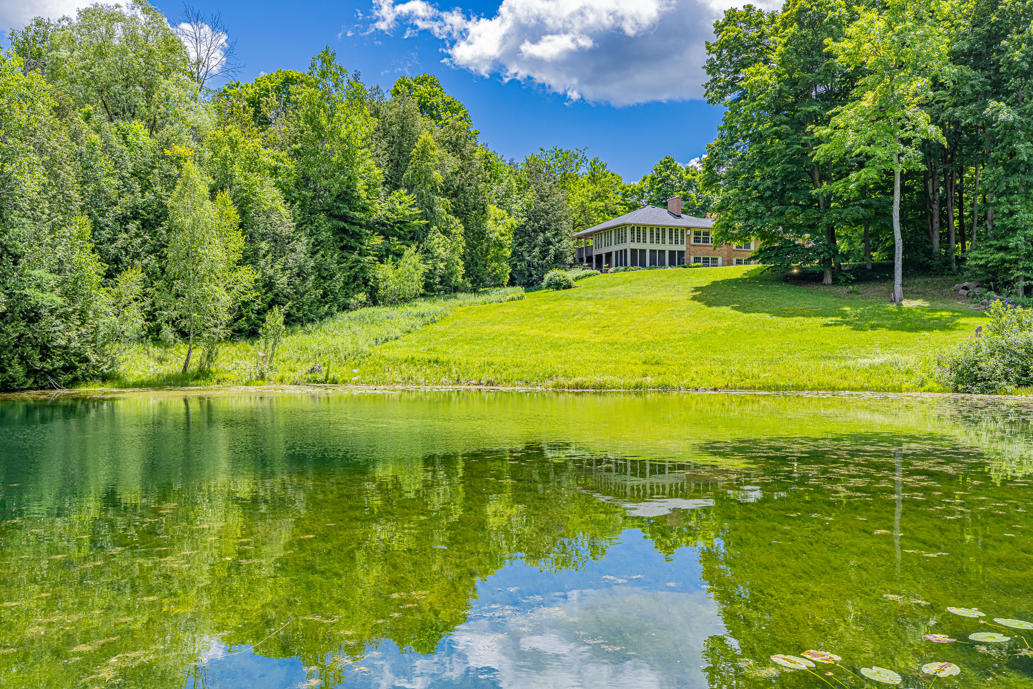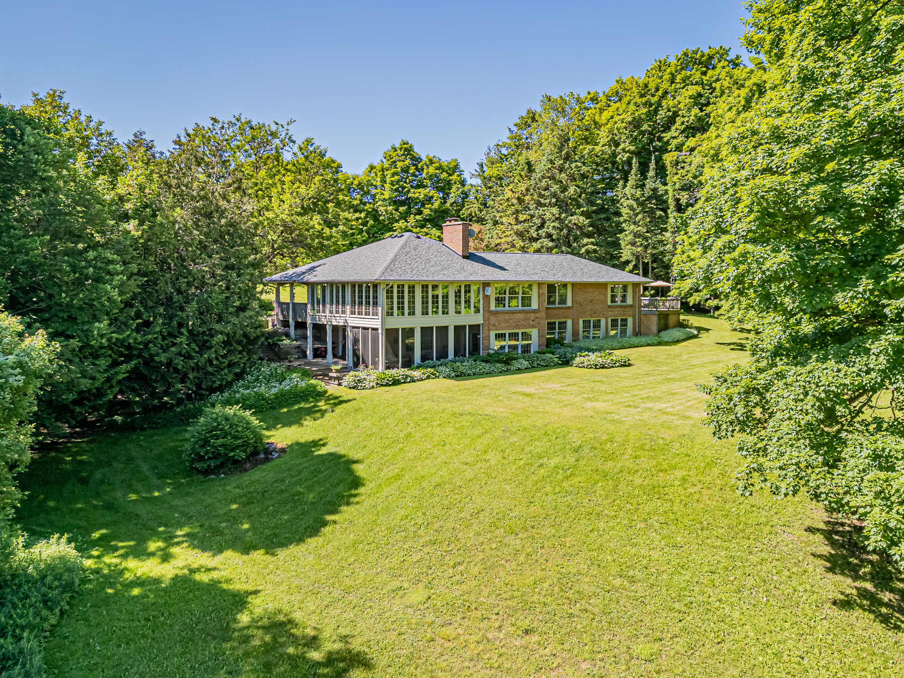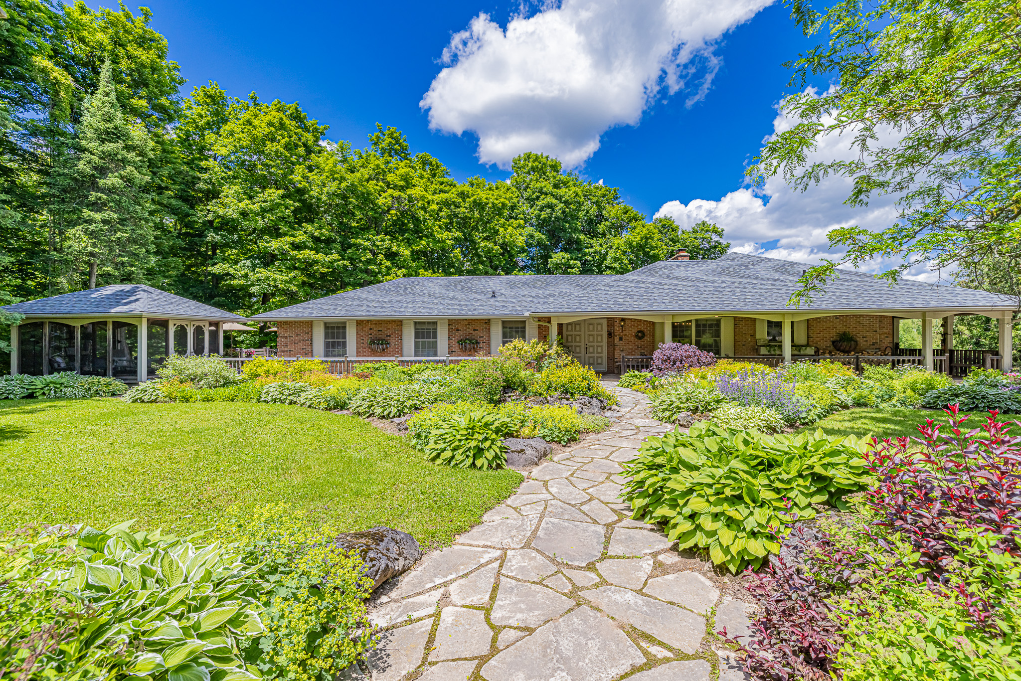 The expansive 4+ bedroom brick bungalow with wrap-around porch and large screened gazebo enjoys lovely views over the property and its mature gardens and towering trees. The property has several kilometers of its own groomed hiking trails which lead around the pond, to the picnic meadow past the paddocks and through the woodlands. The deep valleys plus open meadows make you feel that you are miles away from civilization and yet you are only 10 mins to Erin or 15 mins to the Georgetown GO Station.
