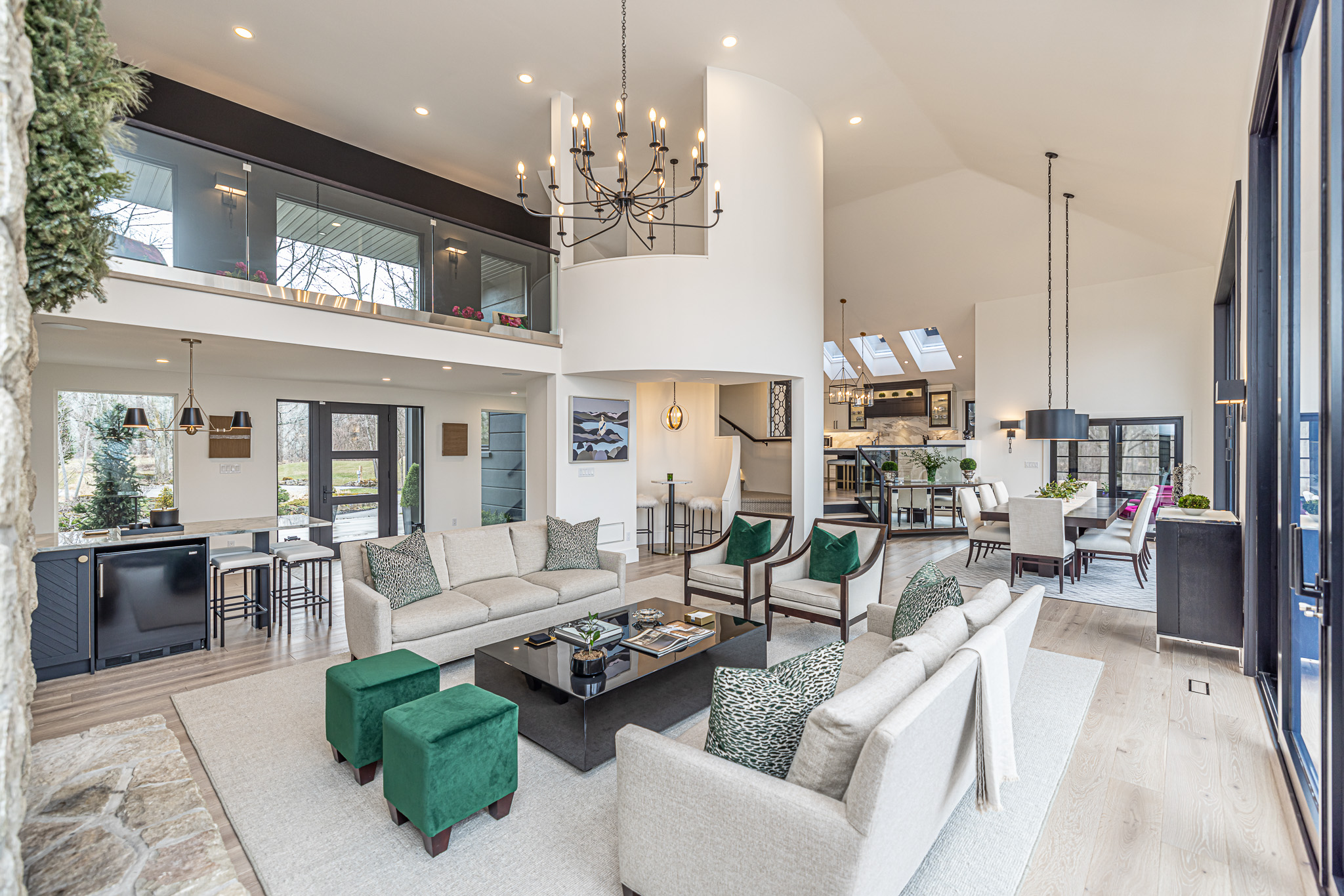 The main floor has an impressive 2-storey great room with stone fireplace, bar area plus massive glass windows which showcase the distant views. Alongside the great room is the dining room which is overlooked by the custom kitchen with walk-in pantry.