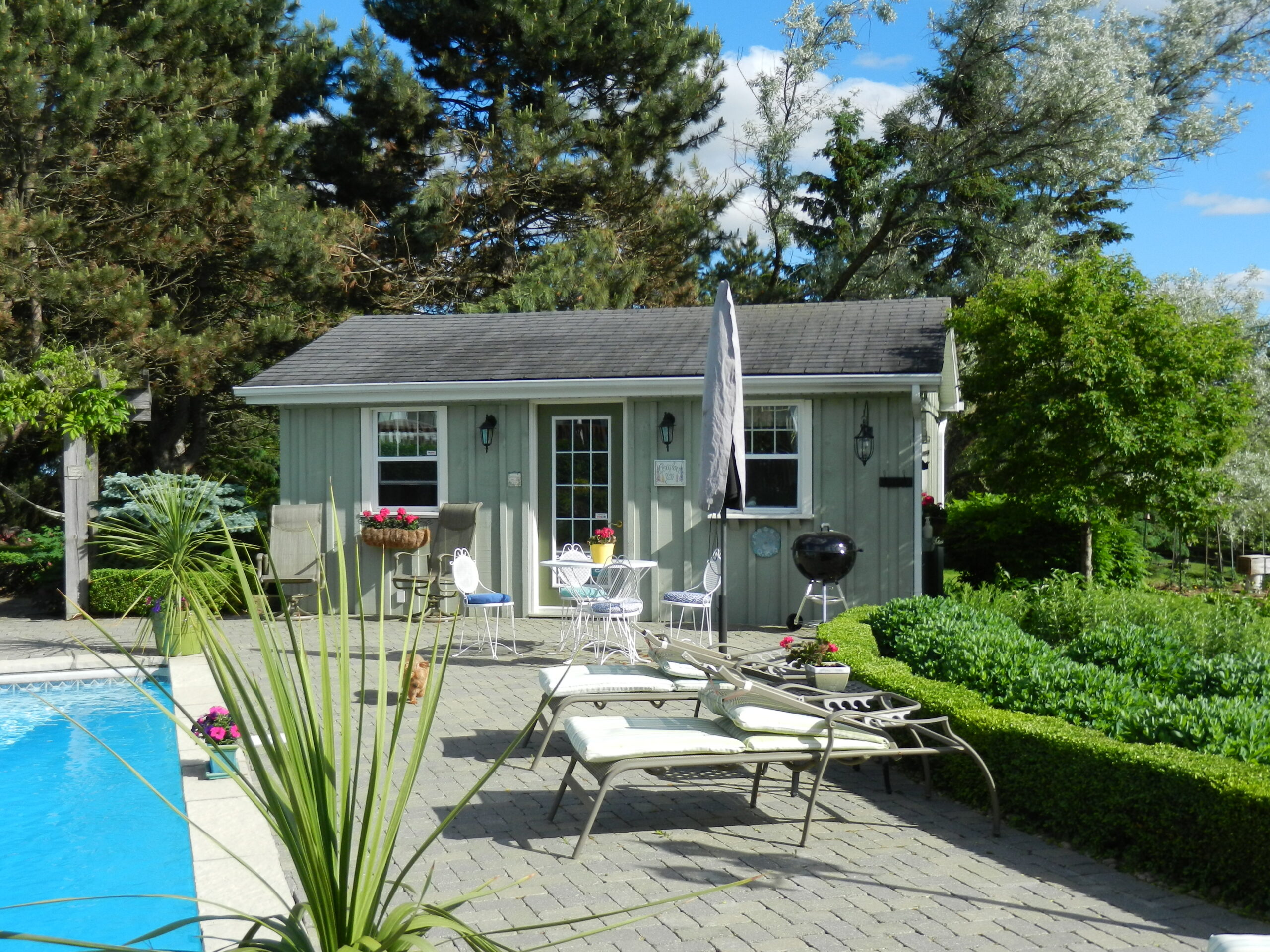 Enjoy sunsets on the west facing deck, overlooking the stunning perennial gardens, pool, pool house and waterfall.