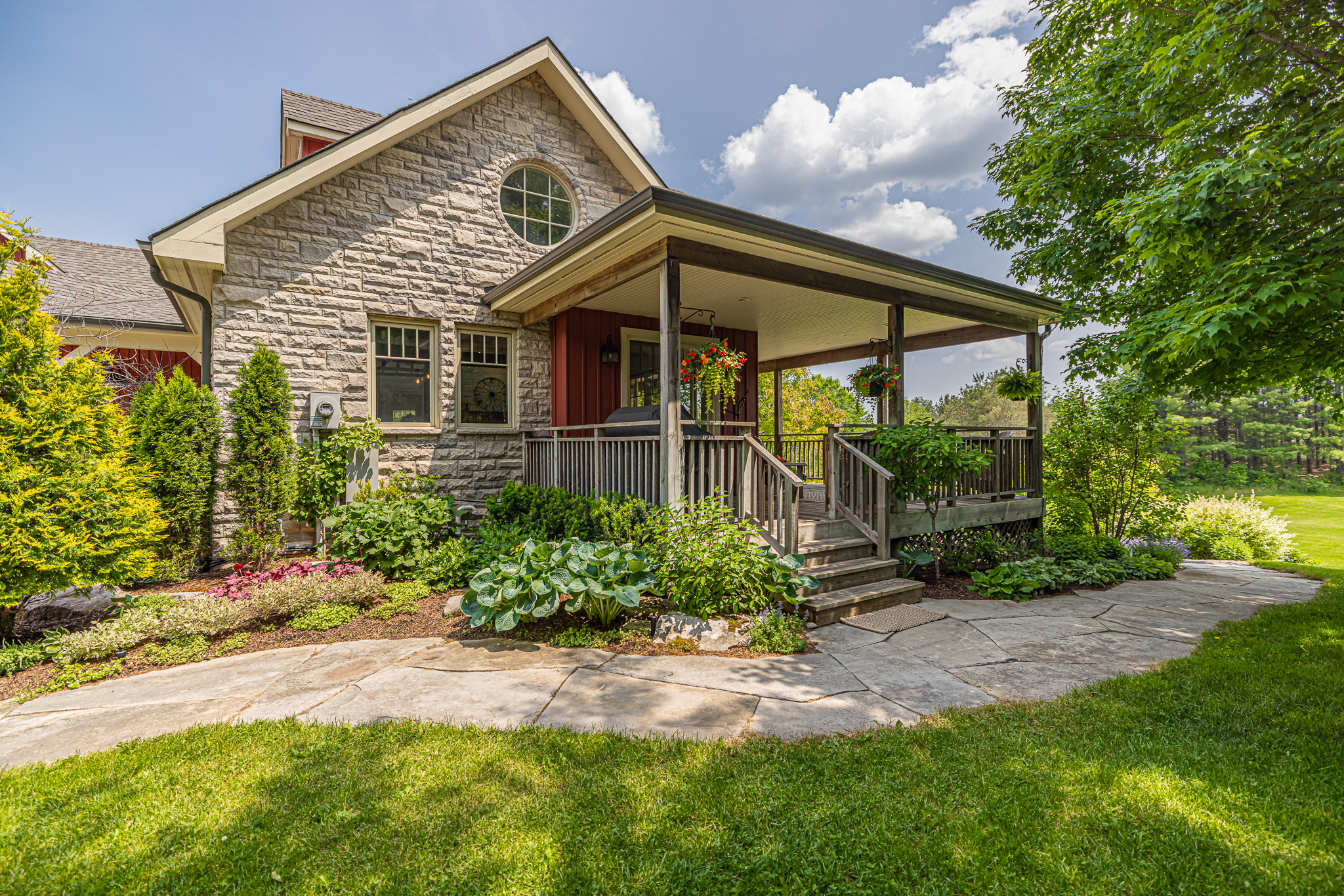 The renovated 4-bedroom main house and attached 3 car garage is finished in stone and ‘Maibec’ (Cabot stain-penetrated) board & batten, and is surrounded by covered cedar decking (upper and lower decks).