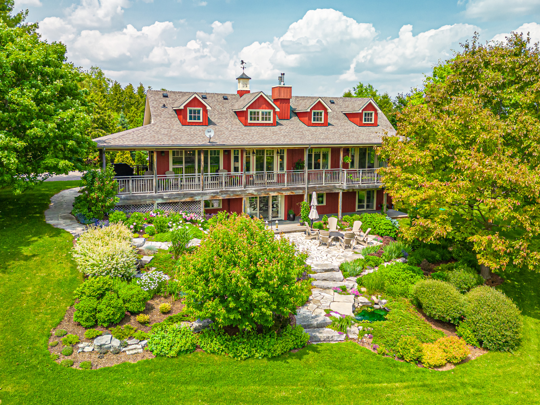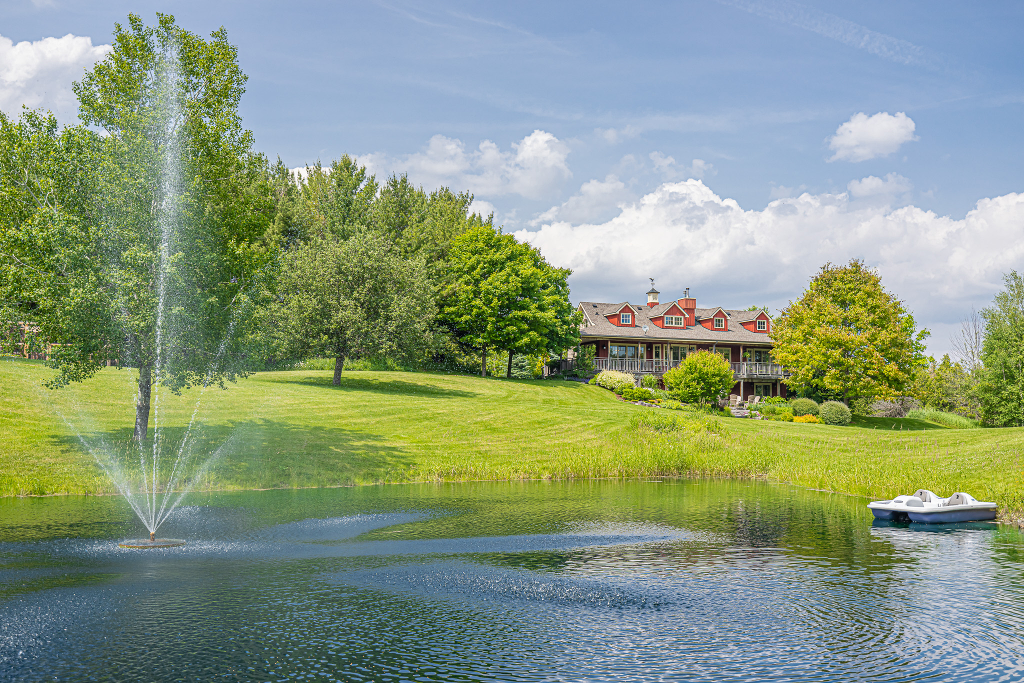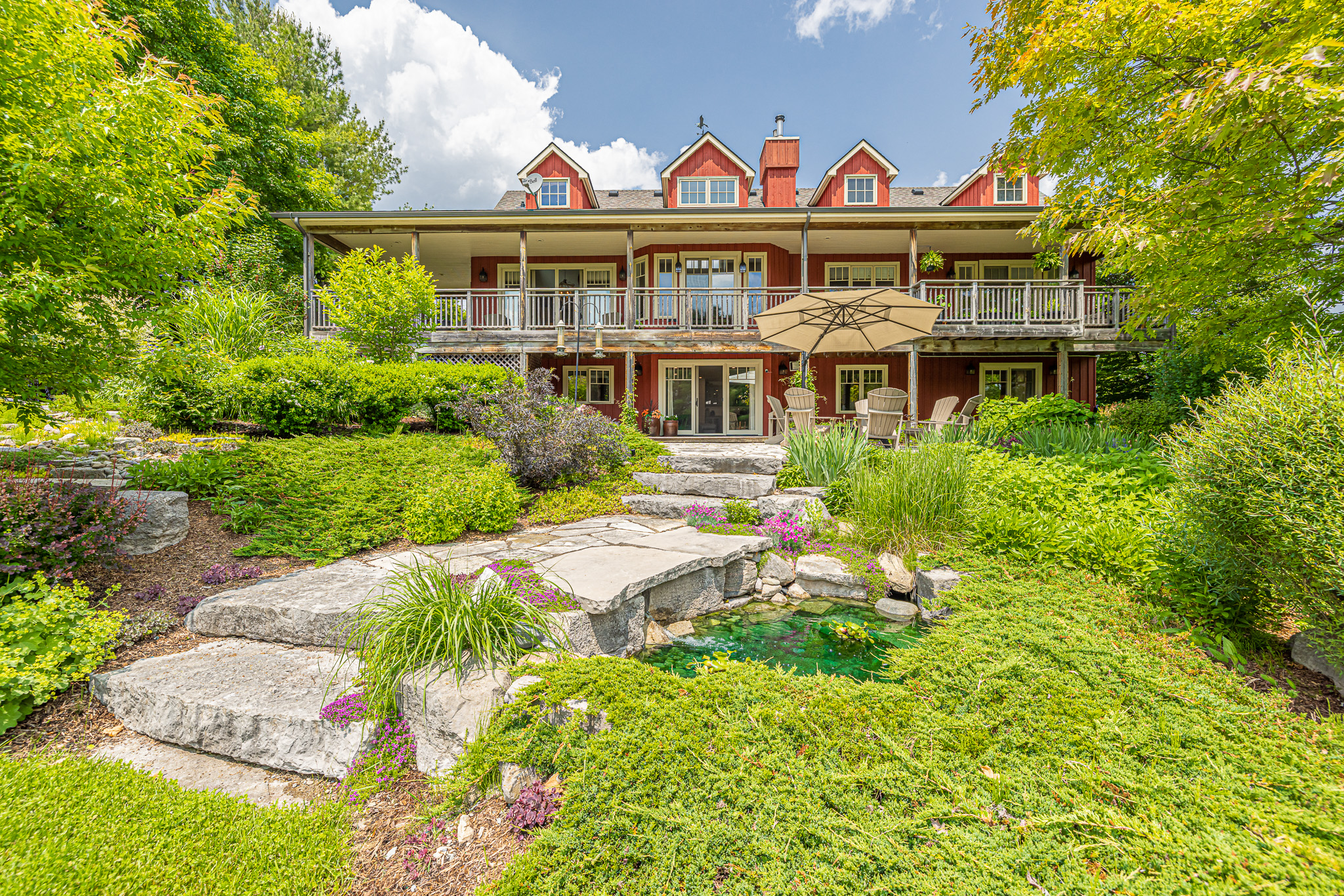 With approximately 993 ft. of road frontage, the 45-acre property is segmented into 10 acres of open meadows and a 25-acre managed woodlot with the balance including the homesite, ponds, gardens and golf greens for chipping and putting practice.