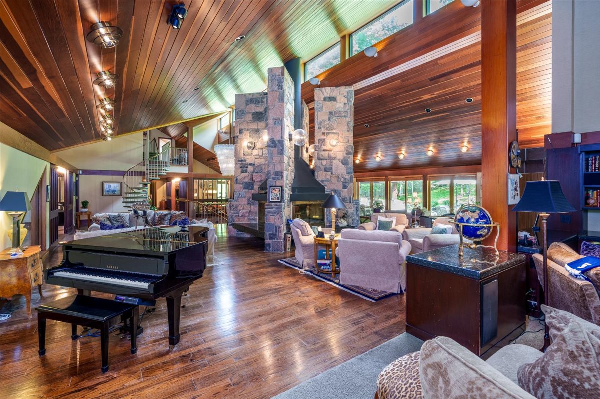 - This was a house designed around a grand living room designed for entertaining. Soaring ceilings surround a 20+ ft 4-sided stone fireplace – a work of art! Large bar, grand dining room, chef’s kitchen plus direct access to the stone patio and outdoor kitchen.